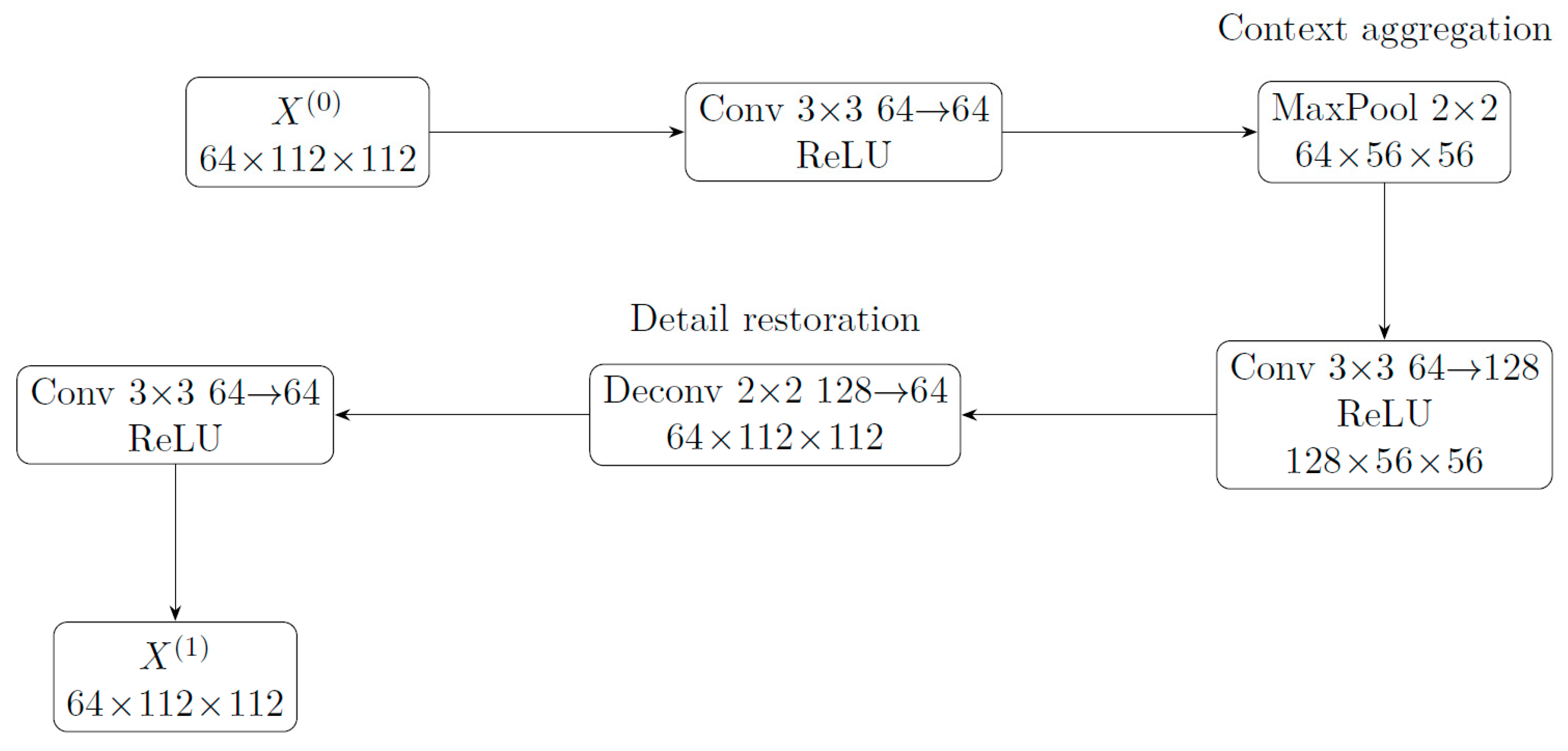 Stage 1 applies two 3 × 3 convolutions (stride 2, padding 1) with ReLU activations to transform input channels from 3 → 32 → 64, producing a 64 × 112 × 112 feature map that balances computational efficiency with representational capacity.