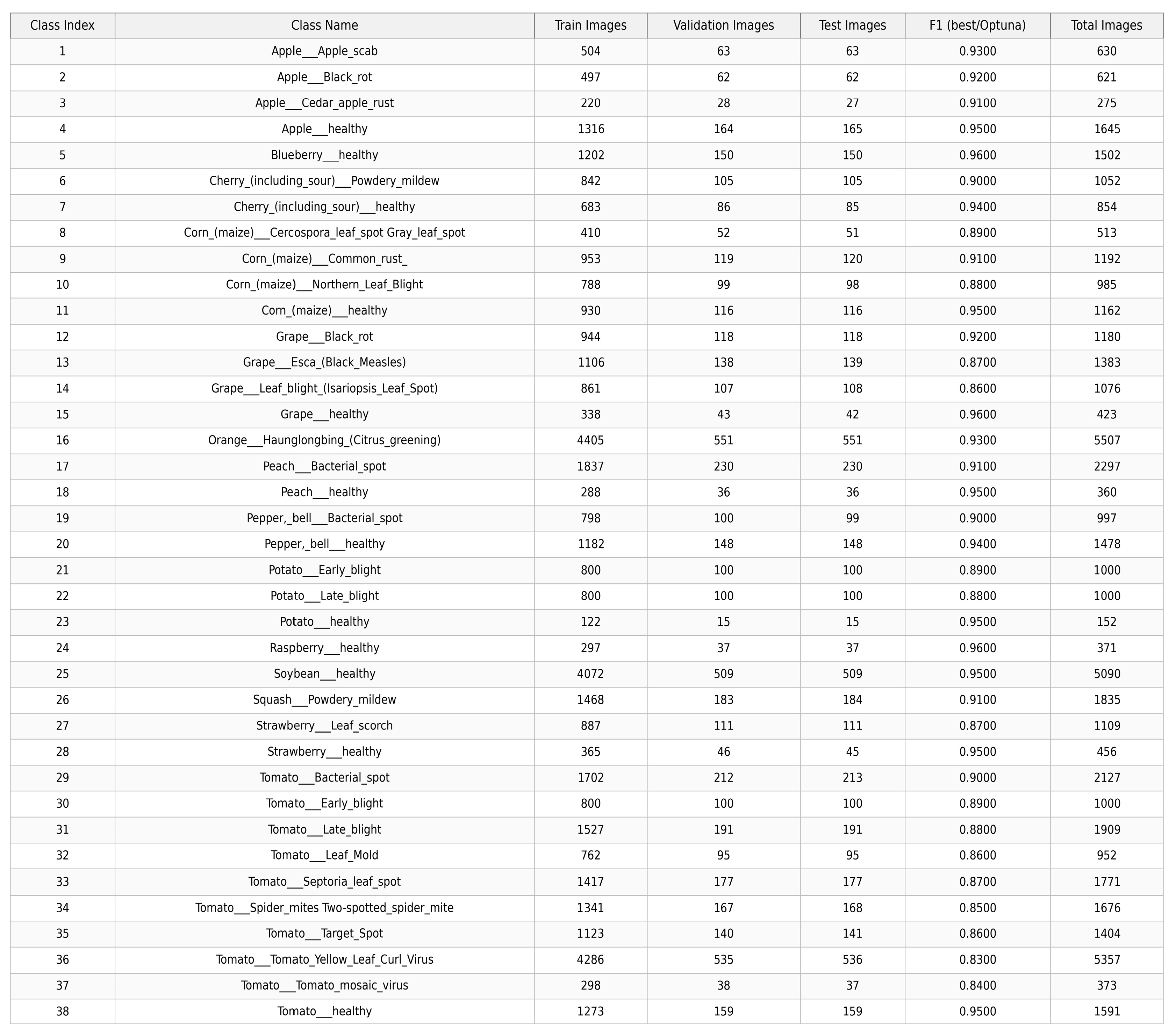 Scale and diversity. The dataset is significantly smaller than PlantVillage and exhibits class imbalance with fewer unique environments per class. This limits intra-class diversity (leaf growth stage, camera-to-subject distance, and background clutter) and increases the risk of memorization for high-capacity models.