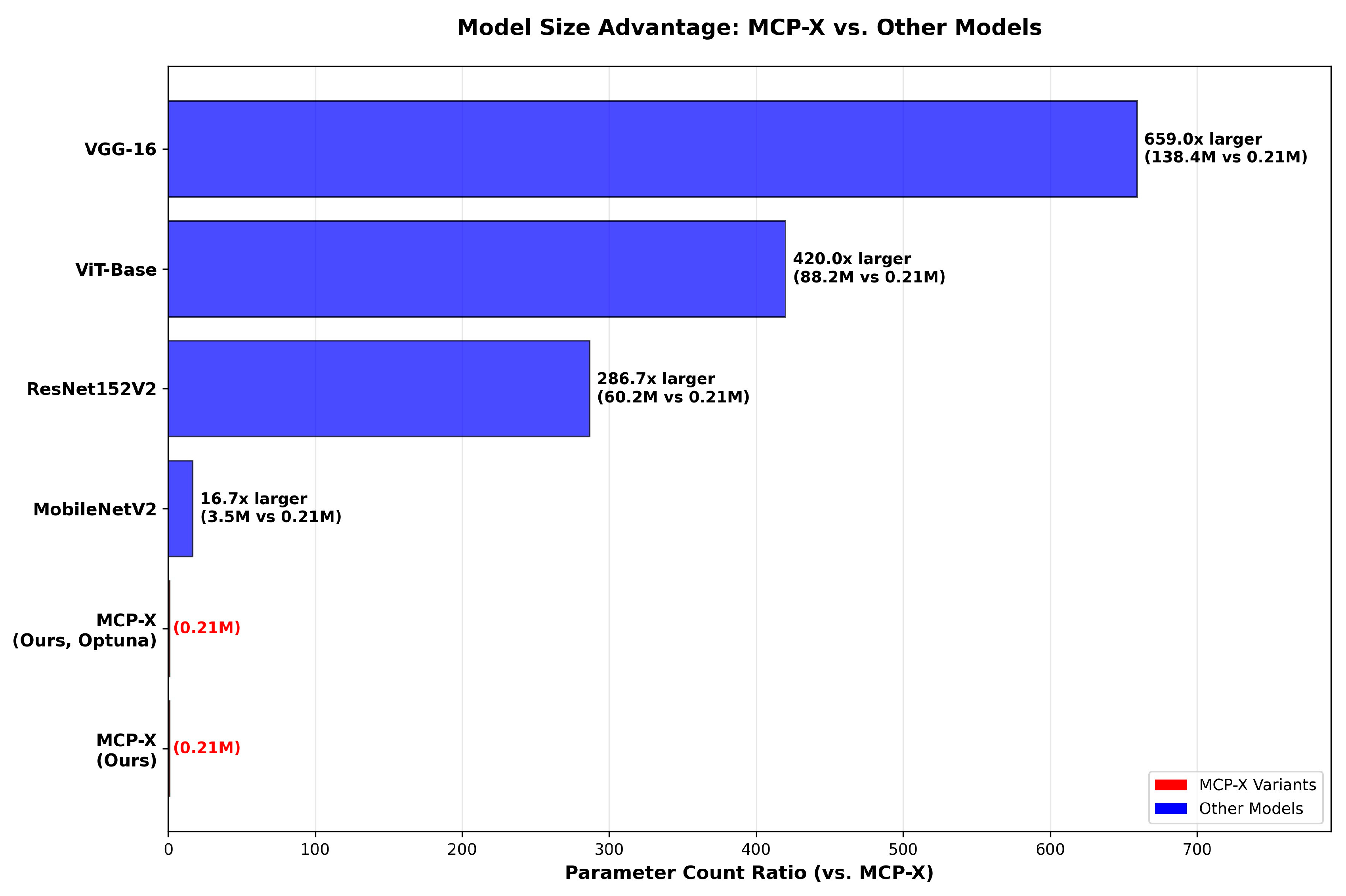 To address these limitations, we introduce MCP-X, an ultra-lightweight CNN pipeline with only 0.21 million parameters, demonstrating strong parameter efficiency.
