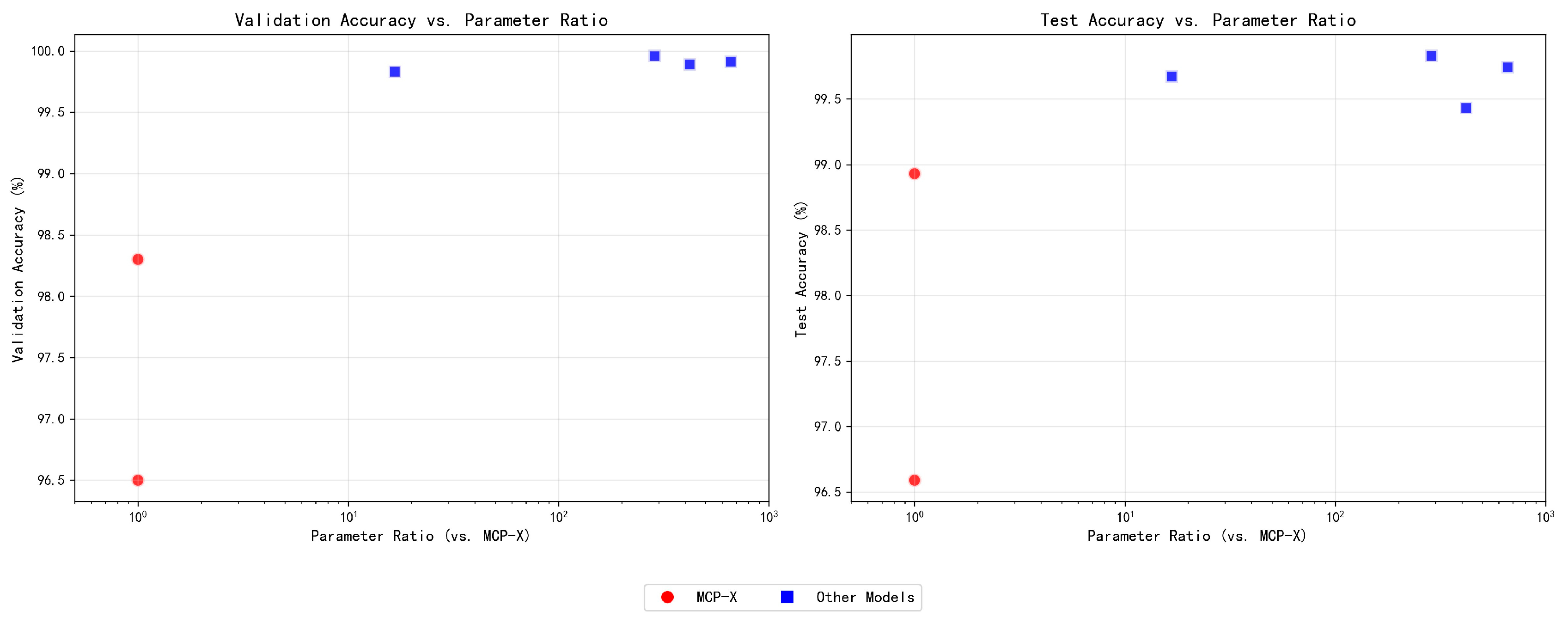 Larger models achieve very high scores, likely due to overfitting on this smaller, noisier dataset, while MCP-X maintains competitive performance (96.59% test accuracy) with far fewer parameters, demonstrating better parameter efficiency and potential robustness in real-world scenarios.