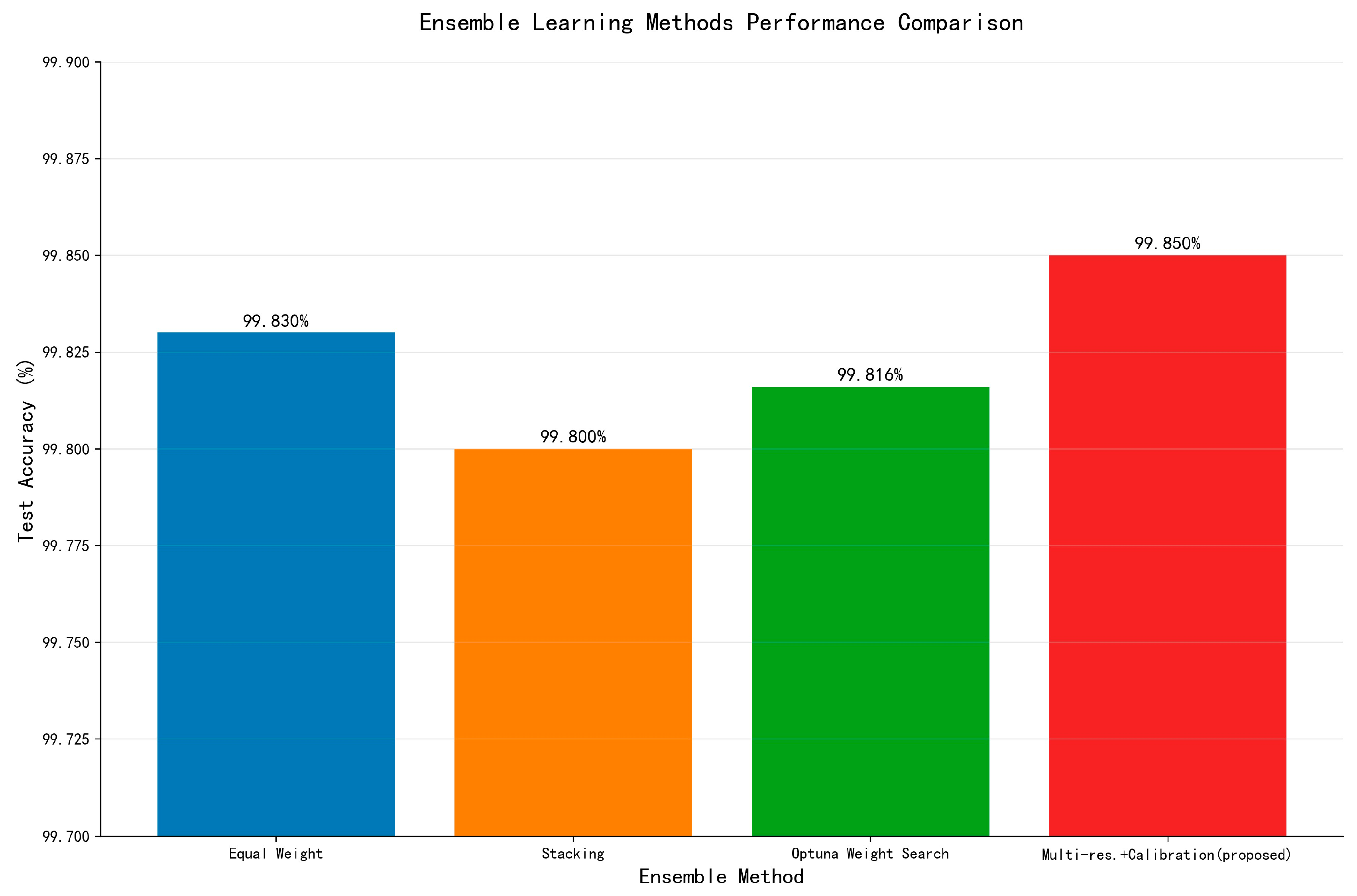 The multi-resolution fusion with calibration (proposed method) achieved 99.85% test accuracy (upper bound; not default deployment) under the unified protocol (