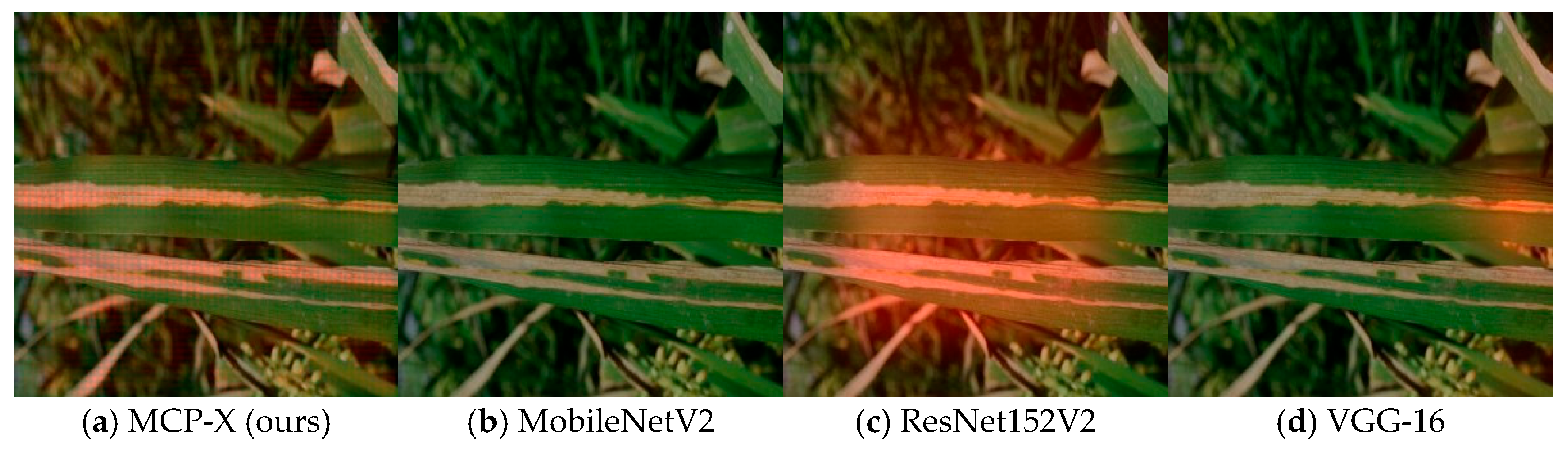 16] proposed ERCP-Net, combining channel attention with residual structures for plant disease classification, but its higher parameter counts and reliance on pretraining limit its applicability compared to MCP-X’s compact, from-scratch design.