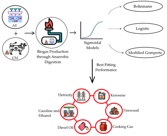 Methodological sequence adopted. The arrow represents the potential conversion of the maximum biogas production estimated by the selected model into various usable forms of energy; image source: Flaticon (Available online: https://www.flaticon.com, accessed on 21 October 2025).