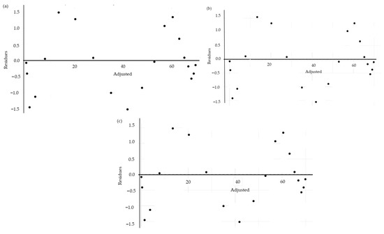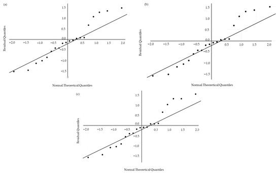 Residual diagnostics supported the overall adequacy of the models. It can be seen in Figure 2 that the residuals indicated overall adequacy to normality, with slight deviations in the upper tail. In the Base fit (Figure 2a), the points followed the reference line across most of the domain, departing only at the highest quantiles, suggesting a slightly right-heavier distribution. The WLS fit (Figure 2b) and the GLS fit (Figure 2c) with a varPower variance function showed a similar pattern, without substantial correction in the tail, which was consistent with the Shapiro–Wilk results. Thus, residual normality was considered acceptable for inference, with the caveat of minor asymmetry at high response levels.