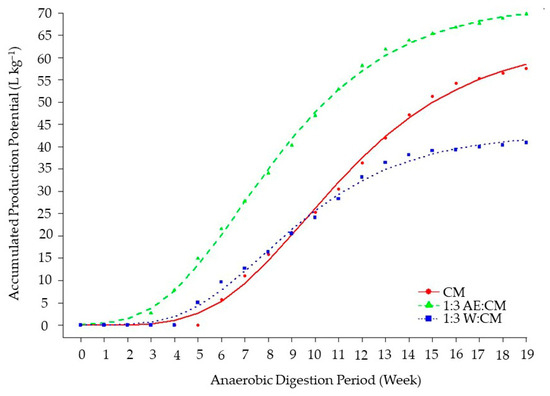 Accumulated Production Potential curves (L kg−1) fitted by the Modified Gompertz model as a function of the anaerobic digestion period (week) for CM, 1:3 AE:CM, and 1:3 W:CM.