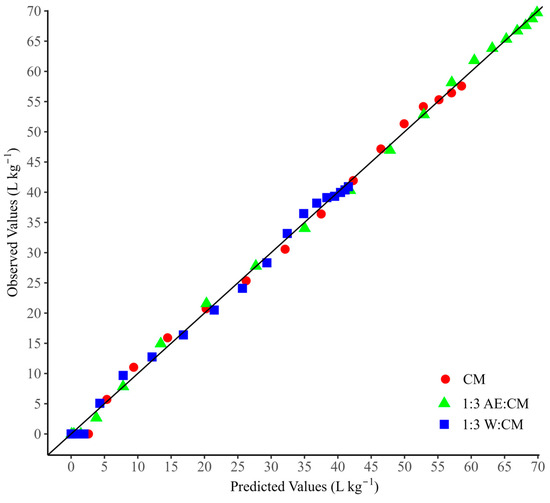The Modified Gompertz model fit was satisfactory for describing the APP (Figure 4), which is corroborated by the strong agreement between observed and estimated values (Figure 5). This proximity confirms the robustness of the model in describing the anaerobic digestion kinetics of the tested substrates. Similar results were reported by Sumardiono et al. (2021) [38], who observed high accuracy of the Gompertz model in predicting accumulated biogas production under different CoAD conditions.