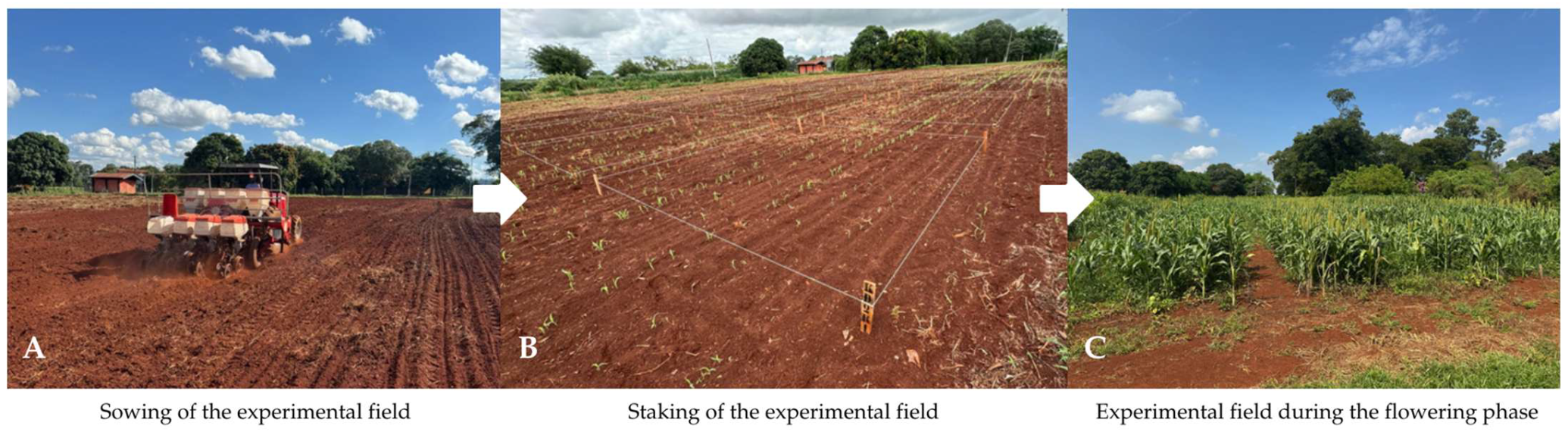 Sowing was carried out mechanically, with a row spacing of 0.50 m and a seed deposition depth of approximately 3 cm. The mechanized system consisted of a Massey Ferguson tractor, model MF4275, pulling a Jumil seeder-fertilizer spreader, model POP 2670, configured with four rows (