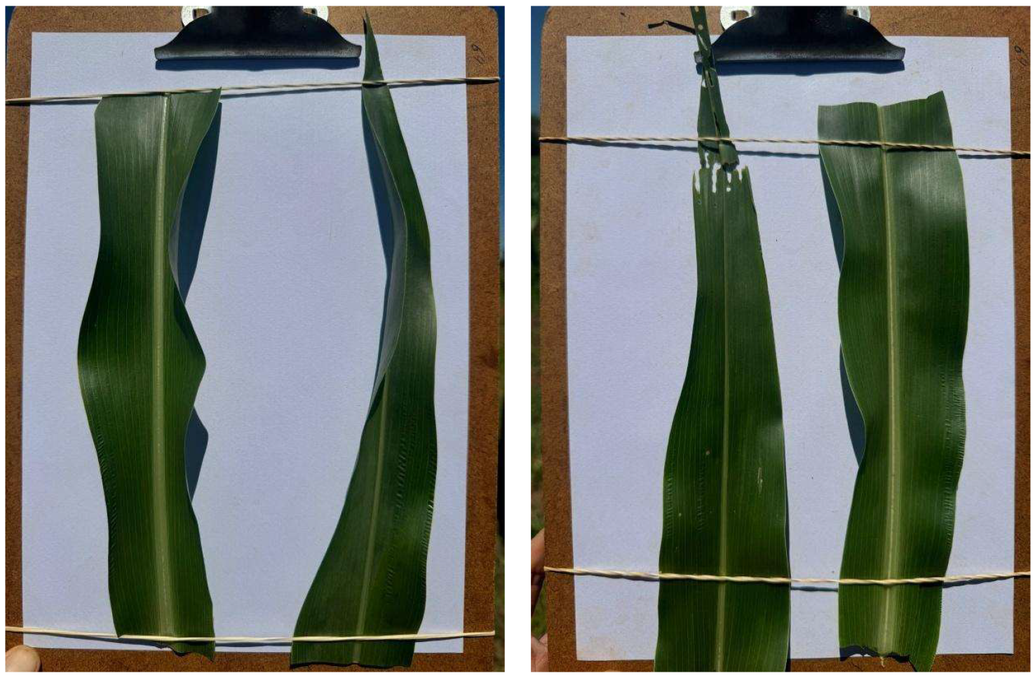 The digital image acquisition procedure at the V4 and Flowering stages was standardized to ensure data quality and consistency. The rear-facing camera of an Apple iPhone 11 smartphone, with 12-megapixel resolution, was used to capture images in Jpeg format. For each sample, the diagnostic leaf was carefully fixed to a clipboard on a white bond paper background, using elastic bands to keep the leaf surface flat and free of wrinkles (