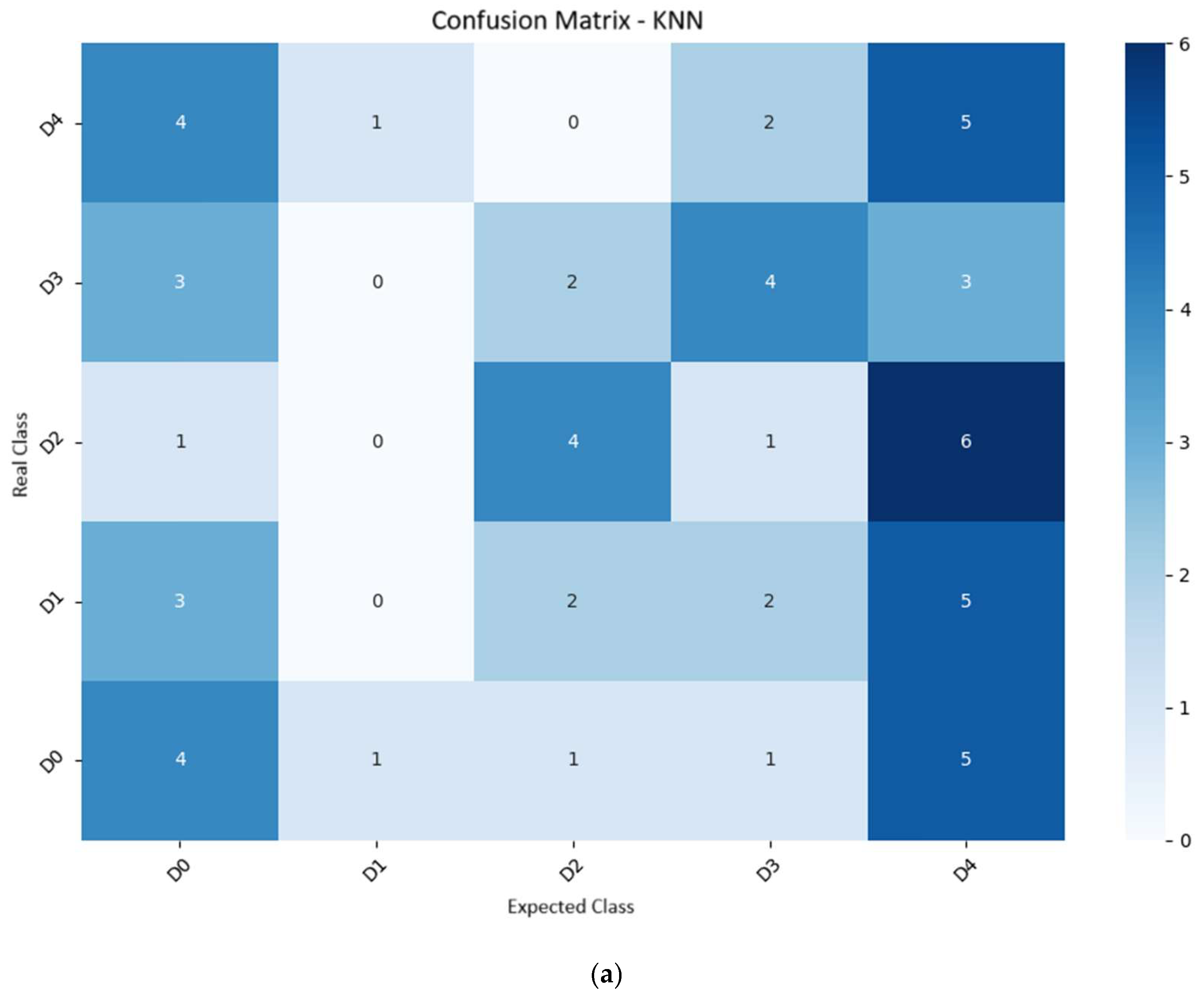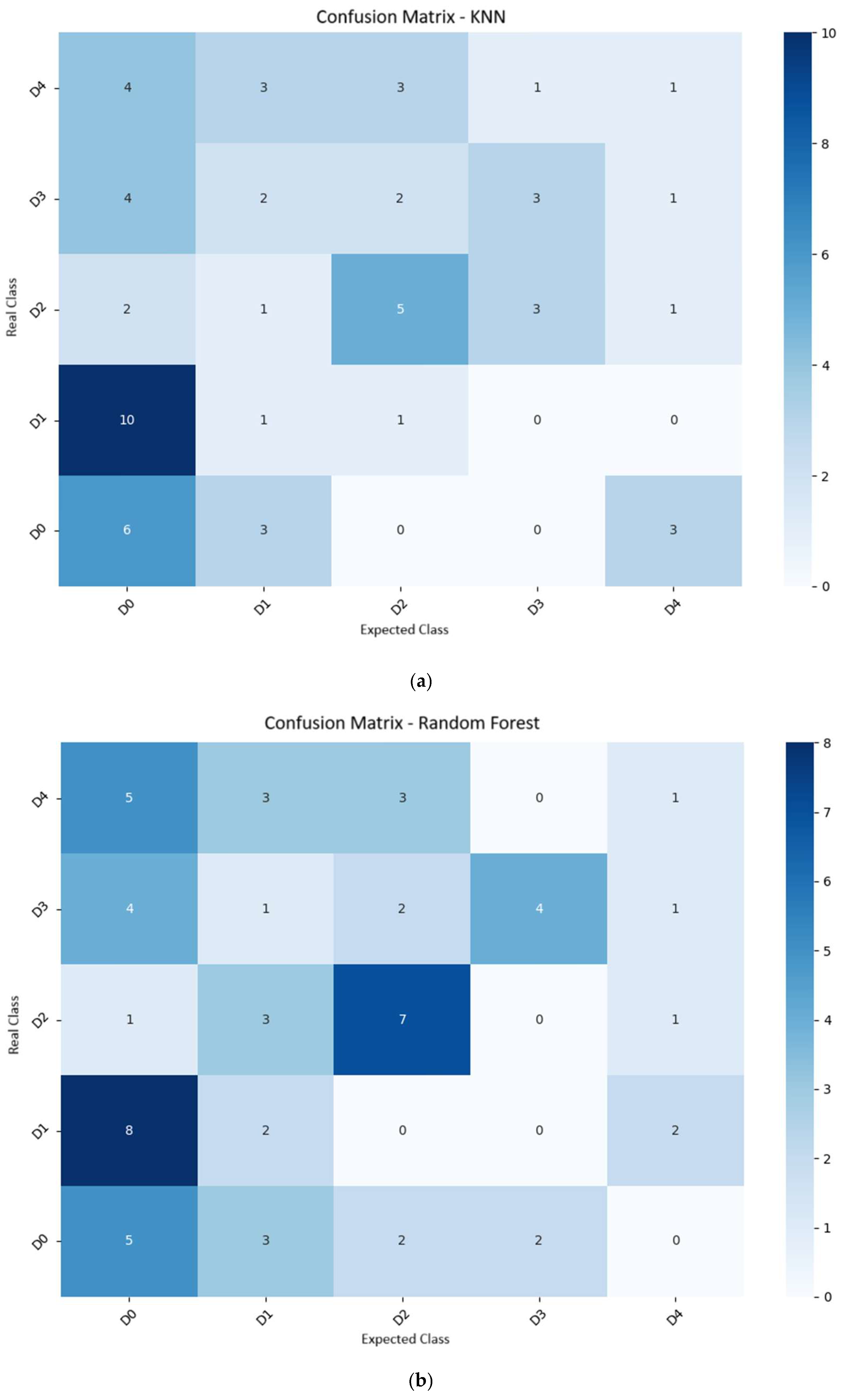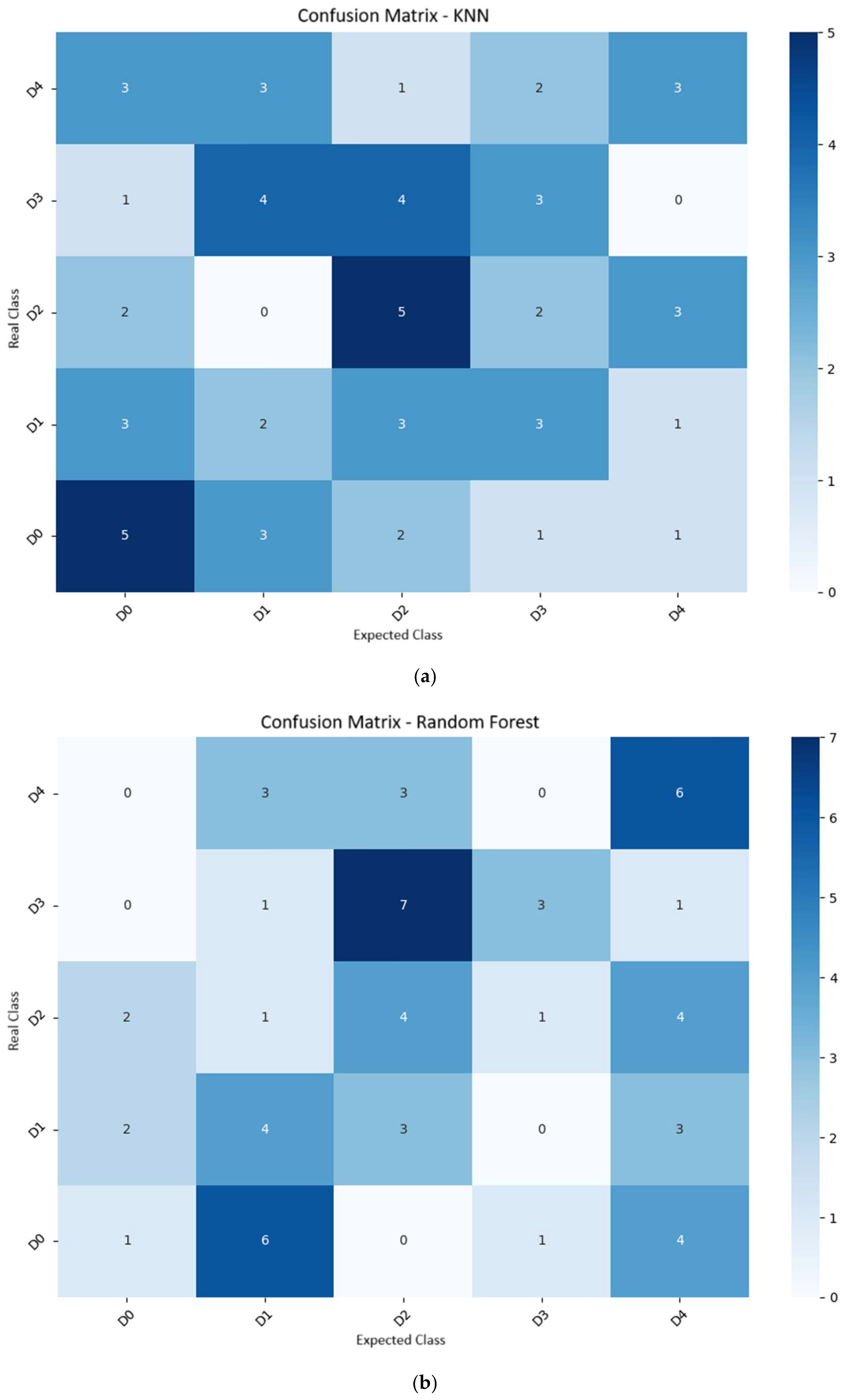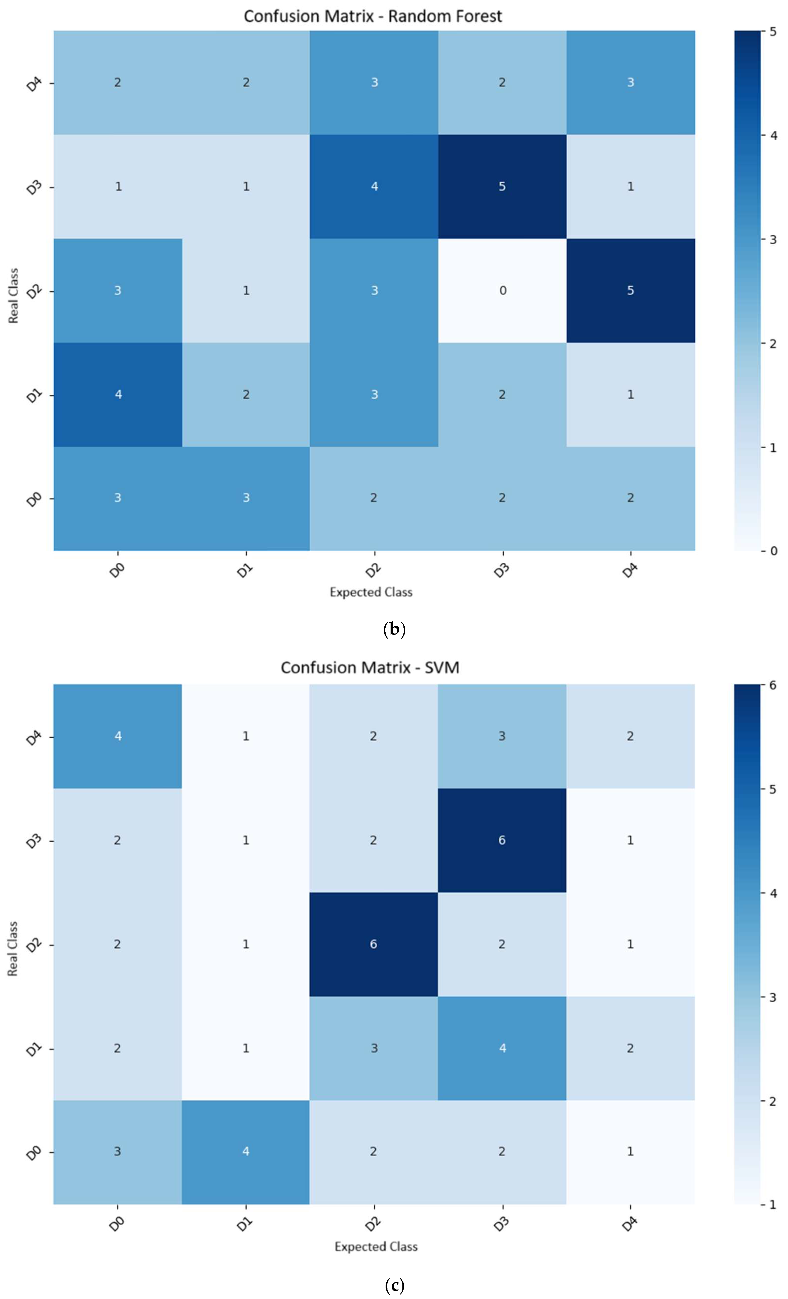 Table 4. KNN achieved an accuracy of 38.3% and an F1-score of 35.1%, demonstrating an increasing ability to distinguish between classes as visual symptoms become more evident and pronounced. Similar results have been reported in other crops, such as in the study by [