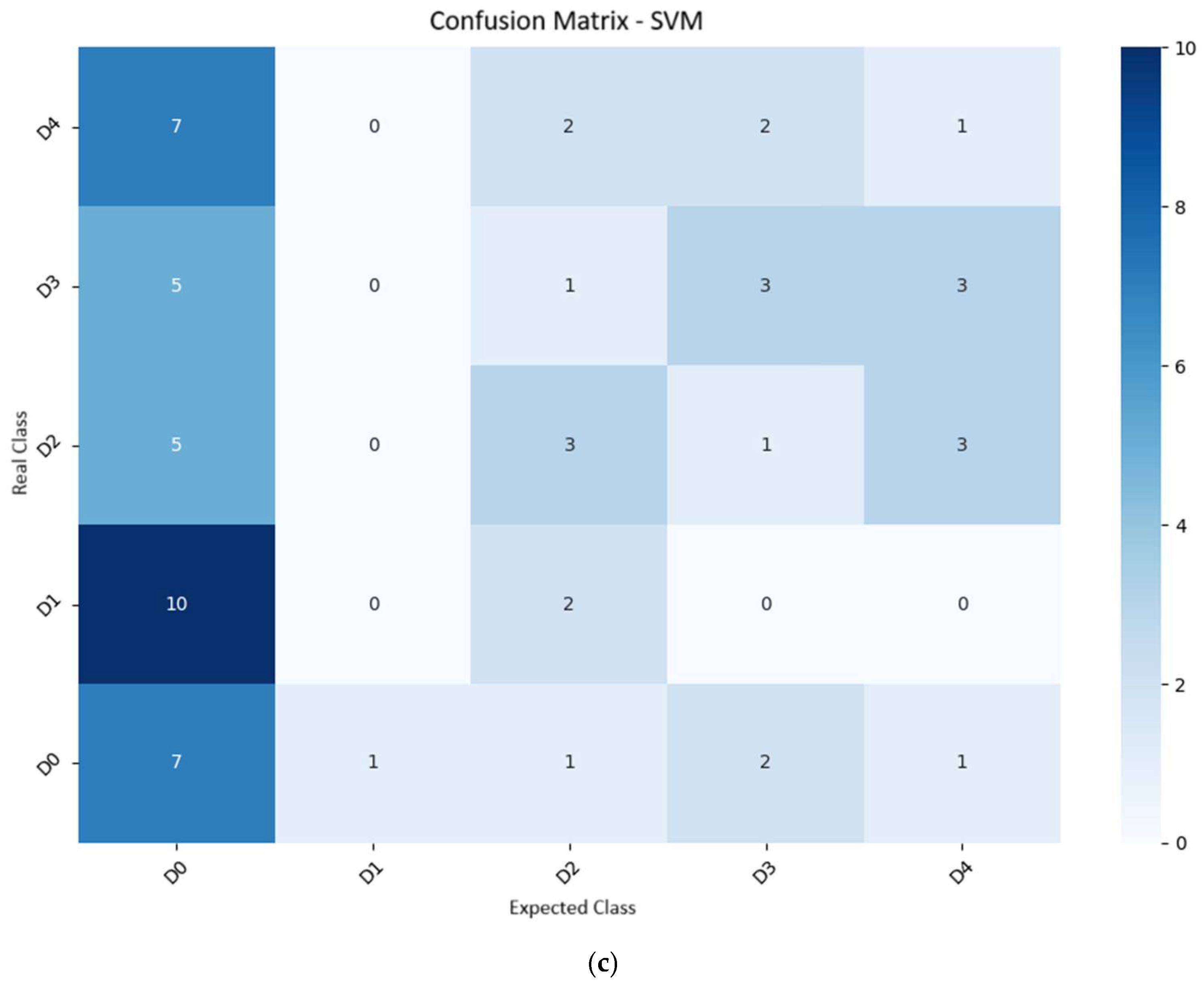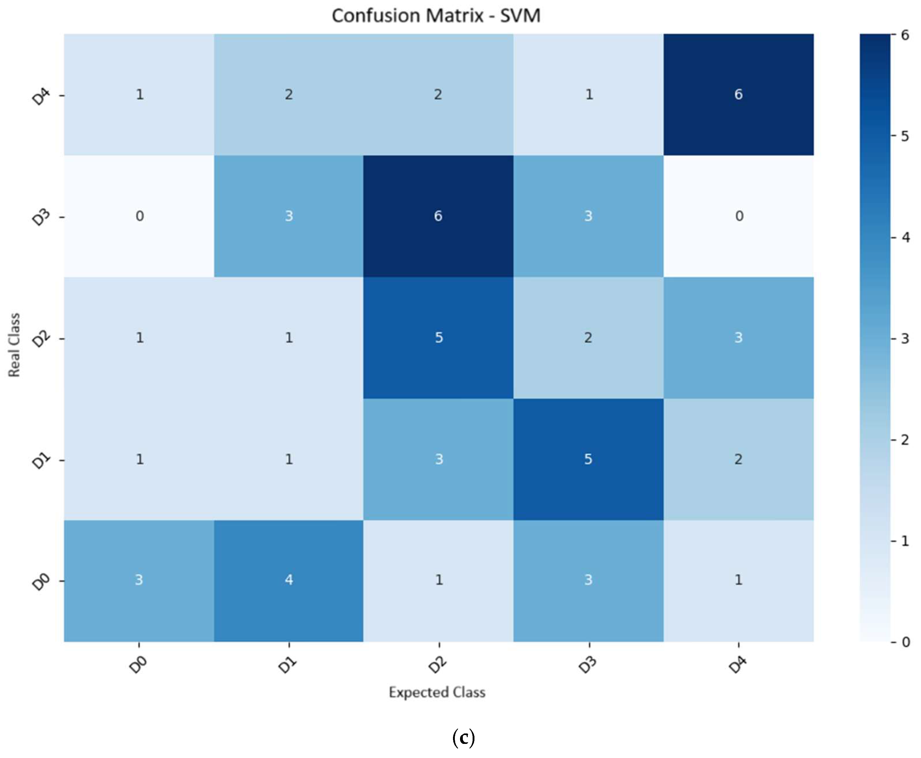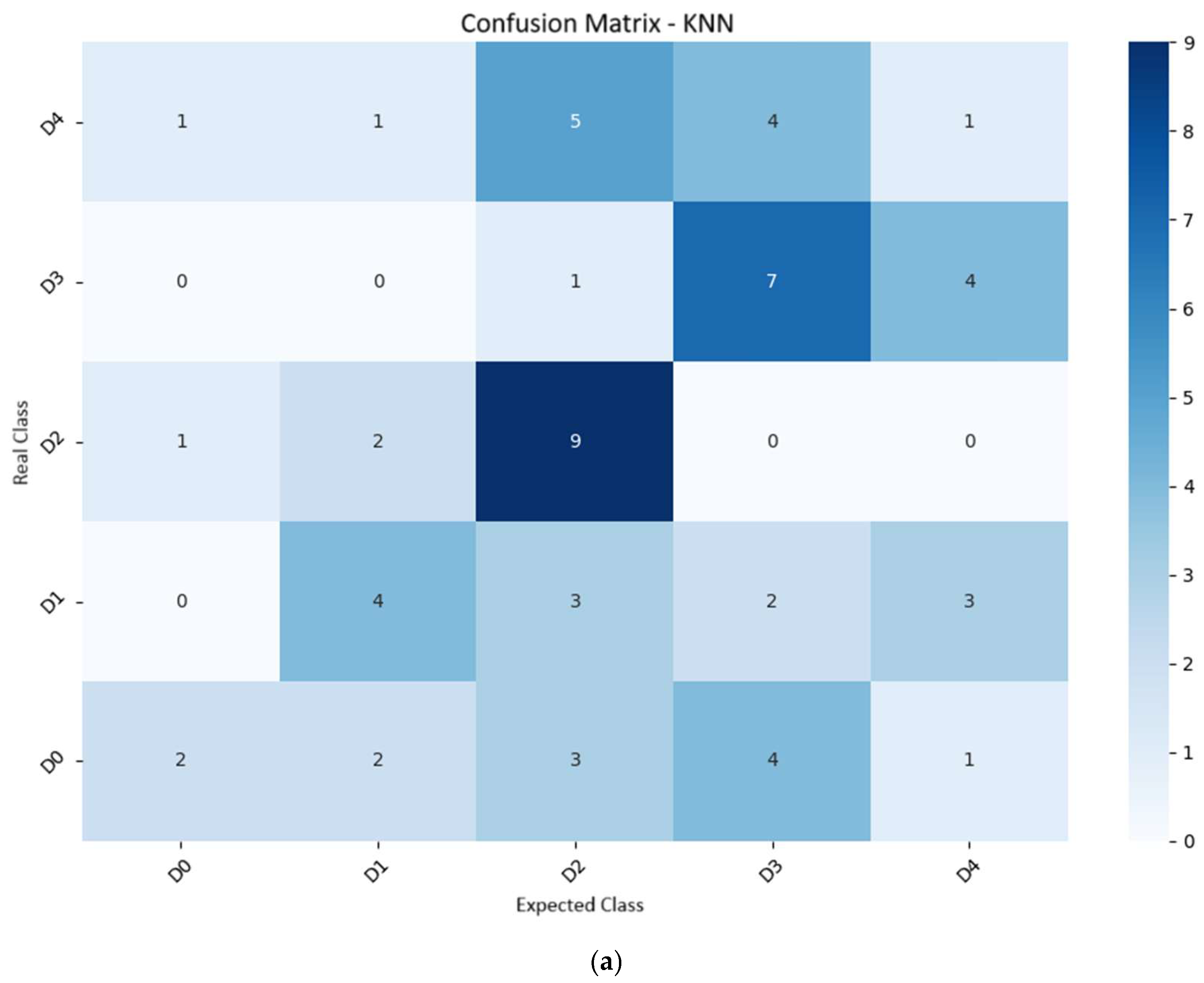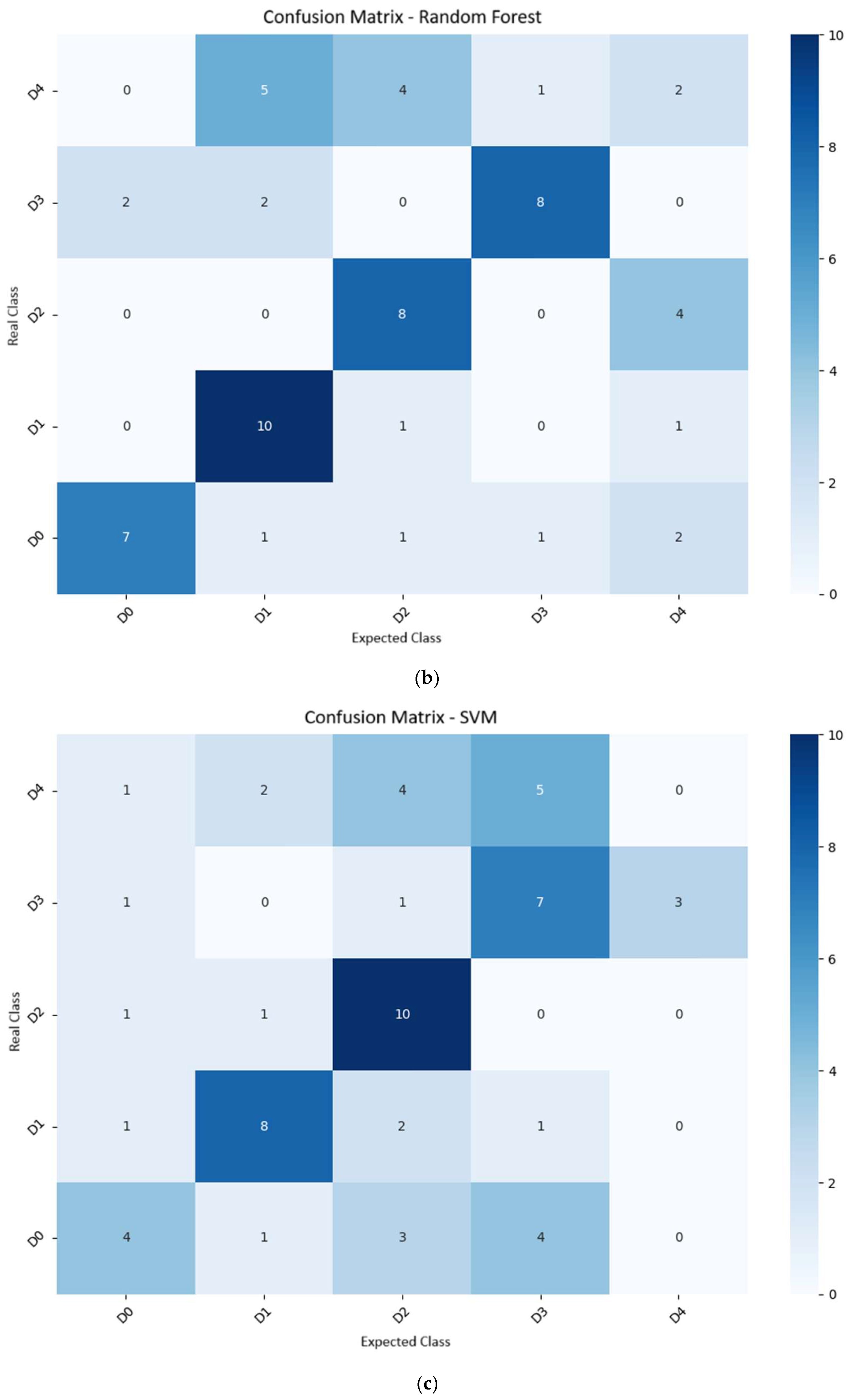 Table 4. KNN achieved an accuracy of 38.3% and an F1-score of 35.1%, demonstrating an increasing ability to distinguish between classes as visual symptoms become more evident and pronounced. Similar results have been reported in other crops, such as in the study by [