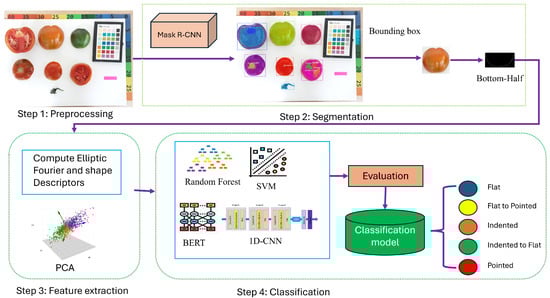Figure 1 illustrates the architecture of our tomato shape classification framework. It consists of four main stages: preprocessing, segmentation, feature extraction, and classification. In the preprocessing stage, raw tomato images are collected and prepared for analysis. The segmentation stage employs a Mask R-CNN model to accurately isolate individual tomatoes from the background and other objects. Next, the feature extraction stage applies Elliptic Fourier Descriptors (EFDs) to encode the contours of each segmented tomato, effectively capturing detailed shape characteristics in a compact numerical form. Finally, the extracted EFD features are used to train and evaluate multiple classification models including SVM, Random Forest, 1D-CNN, and BERT to categorize tomatoes into distinct shape classes.