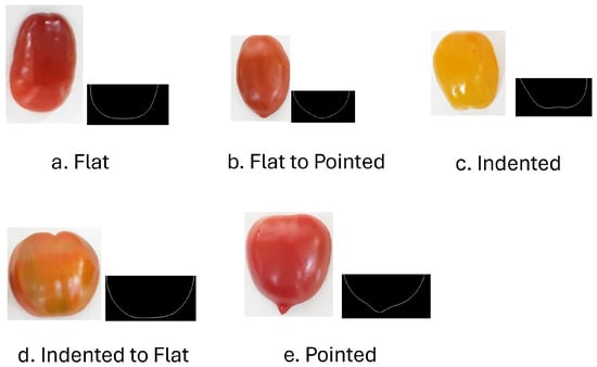 The dataset used in this study was provided by our partner, KNOW-YOU Seed Co. in Pingtung, Taiwan. Based on manual sorting conducted by their experienced fruit growers, five distinct tomato classes were identified, as illustrated in Figure 2. Tomato shapes were classified into five categories: “Flat”, characterized by an elliptical bottom; “Flat to Pointed”, with a slight protrusion from the standard curve; “Indented”, where the contour curves inward toward the fruit’s center; “Indented to Flat”, similar to the “indented” type but with smoother boundaries; and “Pointed”, exhibiting a more pronounced bulge than the “Flat to Pointed” class. In Figure 2, the left side of each category displays the original tomato image, while the right side presents the extracted contour of the bottom half. As illustrated in Figure 2, these shape categories are difficult to distinguish due to their subtle morphological differences.