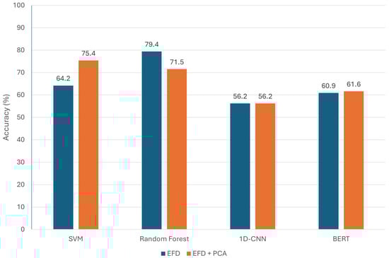 To statistically evaluate the differences in model performance, we conducted pairwise McNemar’s tests on the predictions of SVM, Random Forest, 1D CNN, and BERT as shown in Table 4. The results indicate that Random Forest performs significantly better than SVM, 1D CNN, and BERT. SVM is significantly better than 1D CNN, but its difference with BERT is not statistically significant. Finally, there is no significant difference between 1D CNN and BERT. These results confirm that the observed differences in accuracy among the models are meaningful and not due to random chance.