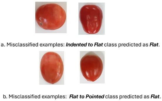 Furthermore, we visualized examples of misclassified images where tomatoes from the “Indented to Flat” and “Flat to Pointed” classes were incorrectly predicted as “Flat” in Figure 7. These errors primarily arise from the subtle differences in contour curvature and the smooth transition between shape categories. As shown in Figure 7a, tomatoes in the “Indented to Flat” class often exhibit only shallow indentations, making their outlines visually similar to “Flat” samples, especially under varying lighting or viewing angles. Similarly, Figure 7b shows “Flat to Pointed” tomatoes with slight tapering that may not be distinct enough for the model to capture through shape descriptors alone. This indicates that transitional classes pose a greater challenge for classification, suggesting that integrating complementary features such as texture or color information could help improve model robustness and discrimination between closely related shape categories.