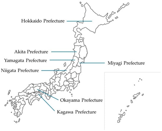 This study examined five polished rice varieties (Akitakomachi, Hinohikari, Hitomebore, Koshihikari, and Nanatsuboshi; Table 1) descended from the Koshihikari lineage that are widely cultivated and distributed throughout Japan (Figure 1), with the largest planting area among the non-glutinous rice varieties harvested in 2023. Three samples of each variety were purchased in 2024 [].