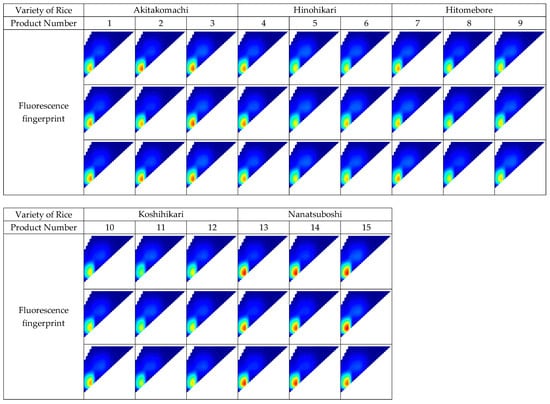 Furthermore, in this study, the CNN model using fluorescence fingerprinting consistently achieved higher discrimination accuracy than the model using NIR spectra. This is likely attributable to the CNN’s capability for extracting detailed patterns from two-dimensional image data using deep-learning algorithms optimized for image processing. The observed image variations are presumed to reflect differences in tryptophan content and other chemical constituents among rice varieties, indicating that fluorescence fingerprinting serves as an effective approach for variety discrimination.