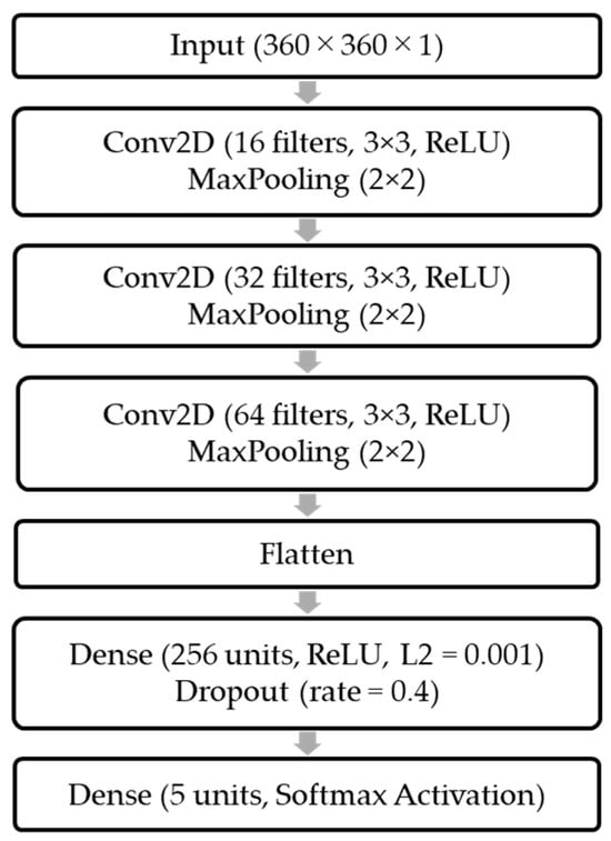 The CNN was constructed using TensorFlow (ver. 2.18.0) and Keras (ver. 3.9). Its configuration comprised three convolutional layers (Conv2D) with 16, 32, and 64 filters, each with a kernel size of 3 × 3. The ReLU activation function was applied throughout, with L2 regularization (coefficient = 0.001). Each convolutional layer was followed by a 2 × 2 max pooling layer (MaxPool2D). Post-convolution, the model included a fully connected dense layer with 256 units, activated by ReLU and regularized with L2, followed by a dropout layer (rate = 0.4) to prevent overfitting. The output layer consisted of five units corresponding to the classification targets, employing a softmax activation function. The model training utilized an initial learning rate of 0.0001, the Adam optimizer, categorical cross-entropy loss, accuracy as the evaluation index, 100 epochs, and a batch size of 16. The ModelCheckpoint mechanisms preserved the network upon achieving peak validation accuracy. The CNN-based identification program was run ten times, and the highest-performing model from each run was saved (.keras format), yielding ten sequentially numbered model files.
