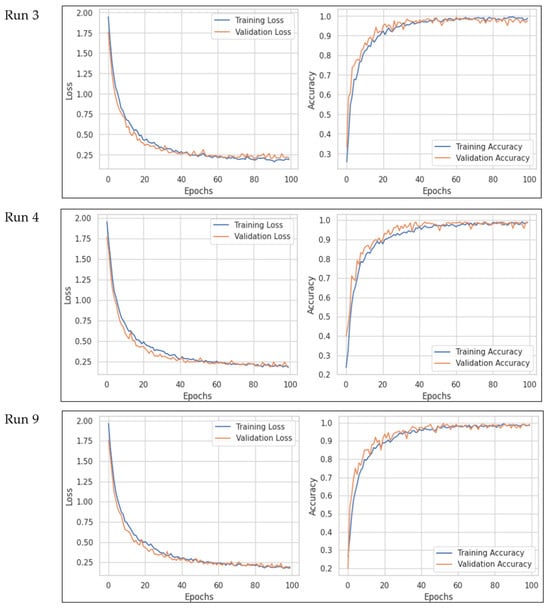 Learning curves of the CNN model for three representative runs (Run 3, Run 4, and Run 9). Training and validation accuracy and loss over 100 epochs show smooth convergence without divergence, confirming stable training and absence of overfitting.