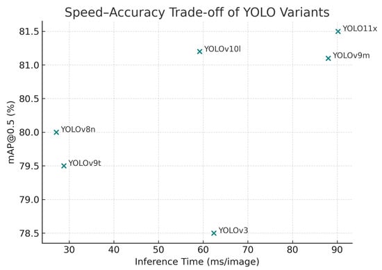 Figure 3. Speed–accuracy trade-off comparison among representative YOLO models. Each point corresponds to a variant, with inference latency (ms per image) plotted against mAP@0.5.