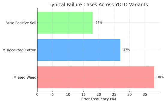 Figure 6. Typical failure cases aggregated across YOLO variants, showing the relative frequency of false-positive soil detections (18%), mislocalized cotton instances (27%), and missed weeds (38%).