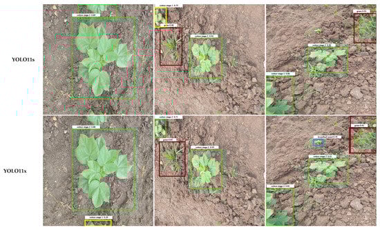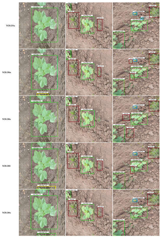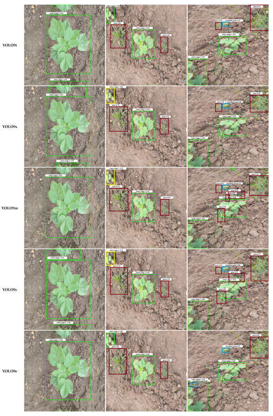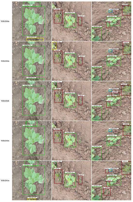 Figure 7. Comparison of output images generated by different YOLO model variants. Each row shows the result for one model, labeled in the left column. Bounding box colors indicate the detected object classes: Weeds include Grass Weed (red) and Broadleaf Weed (Blue), while Cotton Growth Stages include Cotton Stage 1 (Yellow), Cotton Stage 2 (Green), and Cotton Stage 3 (Purple).