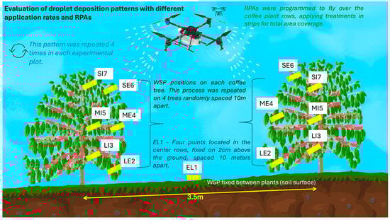 Higher flight altitudes and lower speeds may also contribute to increased droplet penetration. Furthermore, the use of adjuvants and anti-evaporates in a spray can improve droplet durability during application, reducing drift losses and improving coverage conditions. Recent research [23] has discussed that there are greater barriers to penetration, especially droplets with larger diameters, due to the high leaf density of coffee plants, which reinforces that there is an increase in droplet diameter when using low application volumes, restricting penetration within the plant canopy.