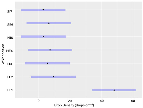 Estimated marginal means of Drop Density (drops cm−2). Black dots indicate mean values for each position (adjusted for other factors). Purple bars indicate confidence intervals (95%) around those means.