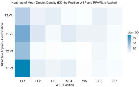 Heatmap for combinations of RPA and application rates adopted according to the Drop Density (drops cm−2) for each WSP position.