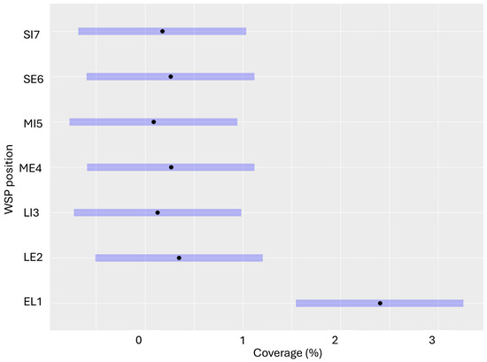 In Figure 5 (showing confidence intervals of marginal means), one can observe that EL1 has the highest mean coverage (2.5%), with no overlap with other positions in terms of confidence intervals (LE2, LI3, ME4, MI5, SE6, and SI7), suggesting a statistically significant difference. Also, all the other positions cluster around 0.2–0.5%, indicating low mean coverage, meaning that there was no serious observational significant difference between coffee tree positions (LE2, LI3, ME4, MI5, SE6, and SI7). Importantly, the large gap between position EL1 and the other positions reinforces that coverage is highly position-sensitive and dominated by EL1. Summarily, in practical terms on the coffee field, this means that EL1 received the highest number of fluid drops compared to any of the other positions considered; this might have been due to its openness to the surface.