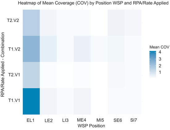 As shown in the heatmap in Figure 6, the RPA combined with the application rate (T1.V1) at the position EL1 had the highest mean coverage (4%), standing out clearly. RPA 1 with application rate 2 (T1.V2) at position EL1 also showed a relatively high mean value (3%), while T2.V1 and T2.V2 at position EL1 and T1.V1 and T2.V2 at position ME showed moderate coverage (1–2 and 1%, respectively). All other positions (LE2, LI3, ME4, MI5, SE6, and SI7) had very low coverage, almost near zero. This suggests that the EL1 position is the dominant contributor to coverage across RPA and application rate settings. To summarize, in practical terms on the coffee field, this means that EL1 received the highest number of fluid drops compared to any of the other positions considered; again, this was likely due to its openness to the surface. Recent research [21] found that the most intense coverage with application aircraft in coffee cultivation occurs in the lower parts of plants, which was a factor that contributed to our results.
