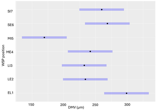 Interpretation of the confidence interval of the marginal DMV mean (Figure 7) showed that EL1 had the highest diameter median, about 300 µm, with no serious overlap with other positions’ confidence intervals (LE2, LI3, ME4, MI5, SE6, and SI7), suggesting a statistically significant difference. Also, all other positions (LE2, LI3, ME4, SE6, and SI7) clustered around 230–270 µm, indicating a moderate mean for DMV, meaning that there were no serious observational significant differences between positions (LE2, LI3, ME4, SE6, and SI7). Position MI5 clearly showed the lowest mean DMV, falling behind the rest.