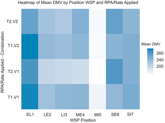 The DMV heatmap (Figure 8) indicated that RPA T10 with application rate 2 (T1.V2) at position EL1 had the highest mean DMV (280 µm), standing out clearly. RPA T10 with application rate 1 (T1.V1) at position EL1 and RPA T20 with application rate 1 (T2.V1) and RPA T20 with application rate 2 (T2.V2) at position SE6 also showed a relatively high mean value (240 µm), while T2.V1 and T2.V2 at position EL1 showed a moderate DMV (200 µm). All other positions (LE2, LI3, ME4, MI5, and SI7) had a low DMV below 200 µm; in particular, position MI5 had a very low DMV, almost zero. This suggests that the EL1 and SE6 positions are the dominant contributors to DMV across RPA/application rate settings.