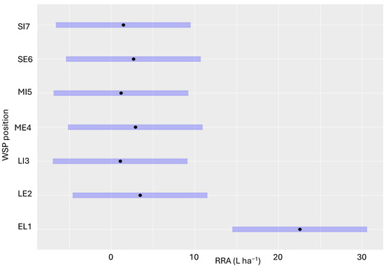 The confidence interval of the marginal mean for the RRA (Figure 9) indicated that EL1 had the highest mean (25 L ha−1), with no overlap with other positions’ confidence intervals (LE2, LI3, ME4, MI5, SE6, and SI7), suggesting a statistically significant difference. Also, all other positions clustered around 0—5 L ha−1, indicating a low mean RRA, meaning that there were no serious observational significant differences between positions (LE2, LI3, ME4, MI5, SE6, and SI7). Importantly, the large gap between position EL1 and the other positions reinforces that RRA is highly position-sensitive and dominated by EL1. In practical terms on the coffee field, this means that EL1 received the highest number of fluid drops compared to the other positions considered; this might have been due to its openness to the surface without any interference.