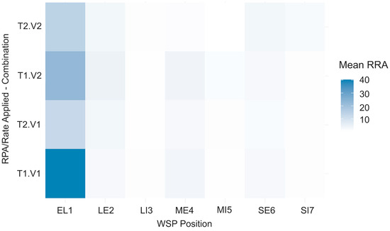 The heatmap in Figure 10 indicates that RPA T10 with rate 1 (T1.V1) at position EL1 had the highest mean RRA (40 L ha−1), standing out clearly. RPA 1 with application rate 2 (T1.V2) at EL1 also showed a relatively high mean value (30 L ha−1), while T2.V1 and T2.V2 at position EL1 showed moderate RRA means (10–20 L ha−1).