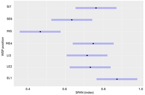 The SPAN index is dimensionless and indicates the quality of applications and the uniformity of drops, so a value closer to 1 (one) indicates a more uniform application and values closer to zero indicate more variability. The SPAN index confidence interval plot (Figure 11) shows that position EL1 clustered around 0.9. Also, positions LE2, LI3, ME4, SE6, and SI7 clustered around 0.6–0.8, indicating moderate SPAN means, meaning that there were no serious observational significant differences between coffee tree positions. Position MI5 clearly showed the lowest means, falling behind the rest. Practically, EL1 produced the highest SPAN, while that of MI5 was consistently lowest, indicating a possible canopy structure effect limiting spray at MI5. Furthermore, the low SPAN indices found in the internal strata specifically reflect the low presence of droplets in these locations and the variability in sizes, with a tendency towards smaller diameter droplets in the interior.