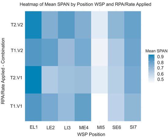 Looking at the SPAN heatmap (Figure 12), we can see that RPA T2 with application rate 1 (T2.V1) and RPA T20 with application rate 2 (T2.V2) at position EL1 had the highest mean (0.9), while RPA T2 with application rate 1 (T2.V1) and RPA T1 with application rate 2 (T1.V2) at position SI7 showed high SPAN values (0.7–0.8). The SPAN indices for positions LE2, LI3, and ME4 clustered around 0.6–0.7, while those for SE6 clustered around 0.5–0.6. Position MI5 had a very low SPAN of almost zero. This suggests that the EL1 and SI7 positions are the dominant contributors to SPAN across RPA/application rate.