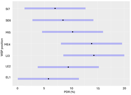 The confidence intervals of the marginal means for PDR showed that positions ME4 and L3 had the highest marginal mean PDR values (Figure 13). Positions EL1, SE6, and SI7 had noticeably lower PDR means (6–10%), indicating less PDR for these positions. The spread of means suggests that mid-field positions tend to receive higher PDR values, while edge or corner positions have lower PDRs. In practical terms, regarding the coffee field, this means that spray penetration or droplet deposition measured by PDR was higher in certain central positions (like ME4 and LI3), possibly due to better canopy coverage and reduced edge loss, while edge positions like EL1 and SI7 received less spray.