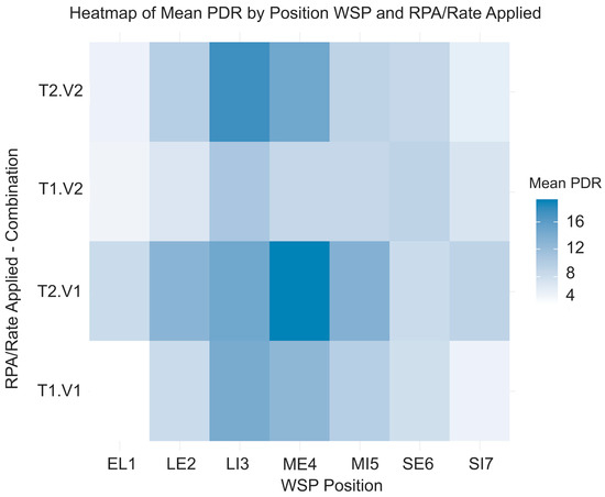 The heatmap for PDR as a function of WSP position and RPA/application rate clearly shows that T2.V2 at LI3 and T1.V1 at ME4 had the highest PDR values (16–18%), standing out from the rest (Figure 14). Lower PDR values were recorded at positions like EL1 and SI7 across most RPA/application rate combinations. This pattern again supports the idea that PDR is position-sensitive, with certain middle positions benefiting from better spray coverage. It also suggests that RPA spraying efficiency can be optimized by targeting certain positions with specific RPA/application rate settings, especially T2.V2 for LI3 and T1.V1 for ME4, while edge positions may need supplementary passes or adjusted spray strategies.