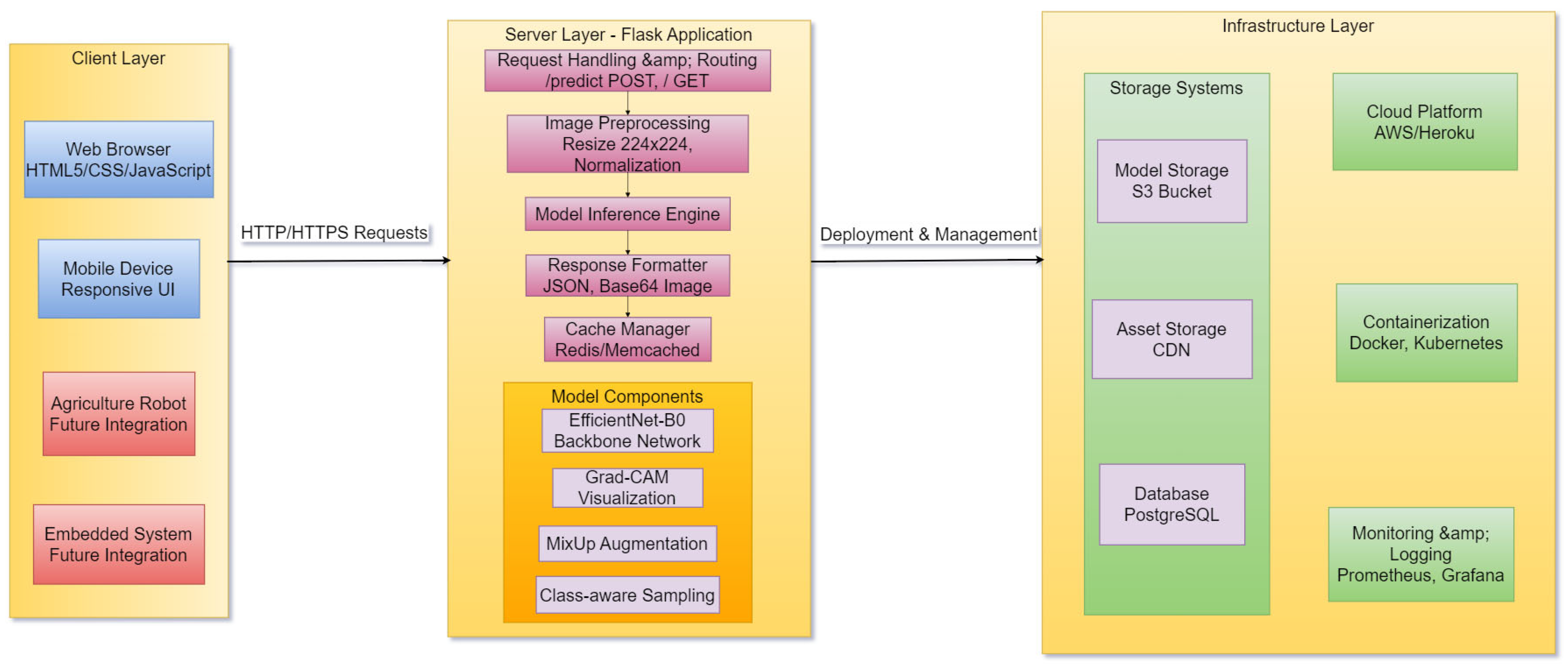 - The platform employs a client–server architecture, comprising a frontend user interface and a backend server. The frontend, built with HTML5, CSS, and JavaScript (V8 12.7.224.18), provides an intuitive interface that supports image uploads, real-time result visualization, and Grad-CAM heatmap display. Bootstrap is utilized to implement a responsive design, ensuring a consistent user experience across smartphones, tablets, and desktop devices—critical for diverse connectivity conditions in rural field settings. The backend is built on Flask and is responsible for image preprocessing, model inference, Grad-CAM generation, and response formatting. To optimize technical performance, the platform implements batch processing and asynchronous request handling, ensuring low latency and efficient concurrent inference. Model weights are loaded into memory for rapid prediction, and GPU acceleration is supported when available. The architecture also incorporates input validation and secure API endpoints to maintain reliability and safety. This design allows scalable deployment on cloud platforms such as AWS or Heroku, facilitating broad accessibility and robust performance across different devices and environments. Figure 5 illustrates the complete system architecture.