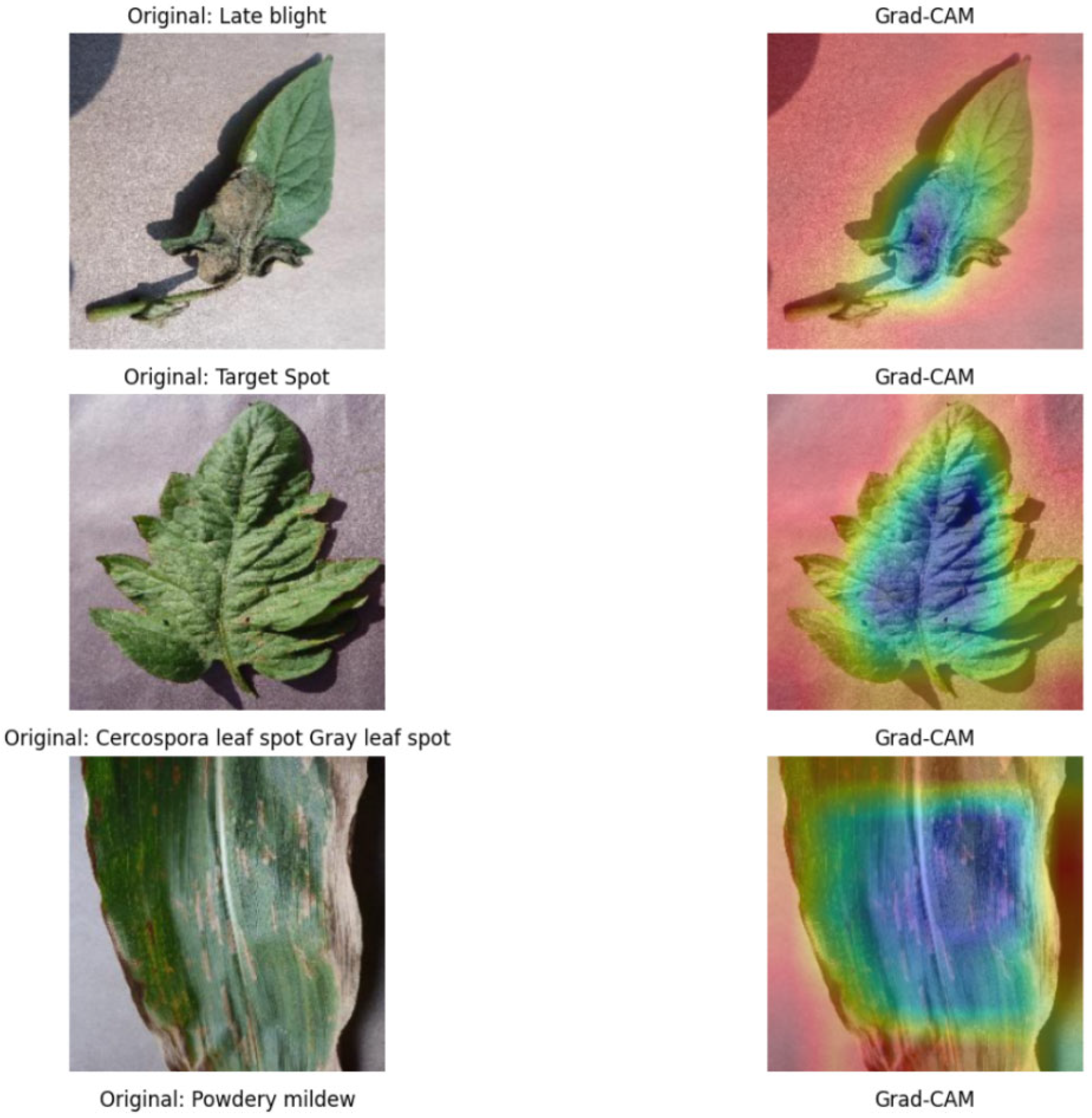 - We integrated Grad-CAM to generate high-resolution class activation heatmaps, enabling precise localization of disease regions within plant images. This visualization approach not only enhances model transparency but also provides agricultural practitioners with intuitive and actionable insights. For instance, farmers can rapidly identify infected leaf areas from the heatmaps, allowing for targeted interventions such as precise pesticide application or pruning, thereby improving disease management efficiency.