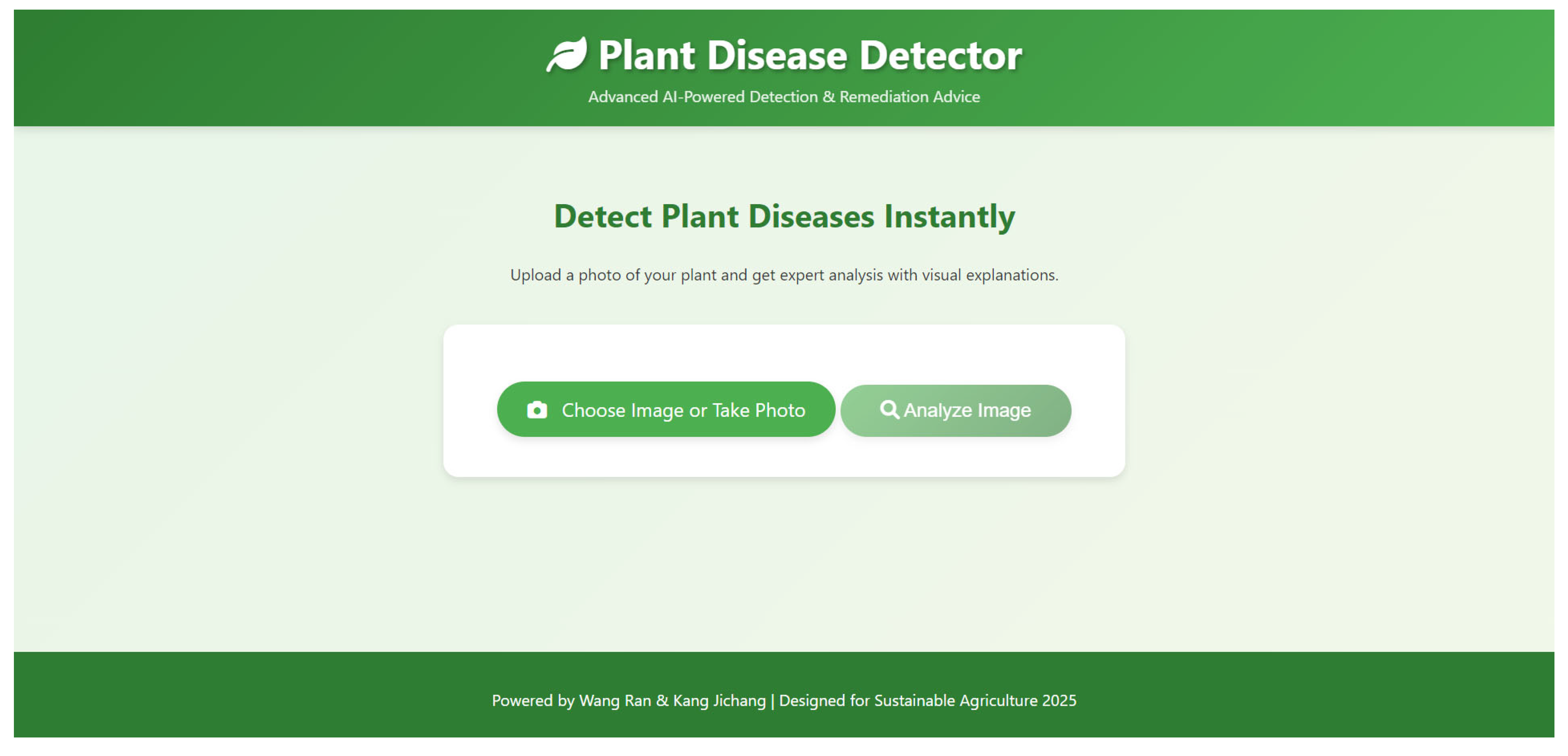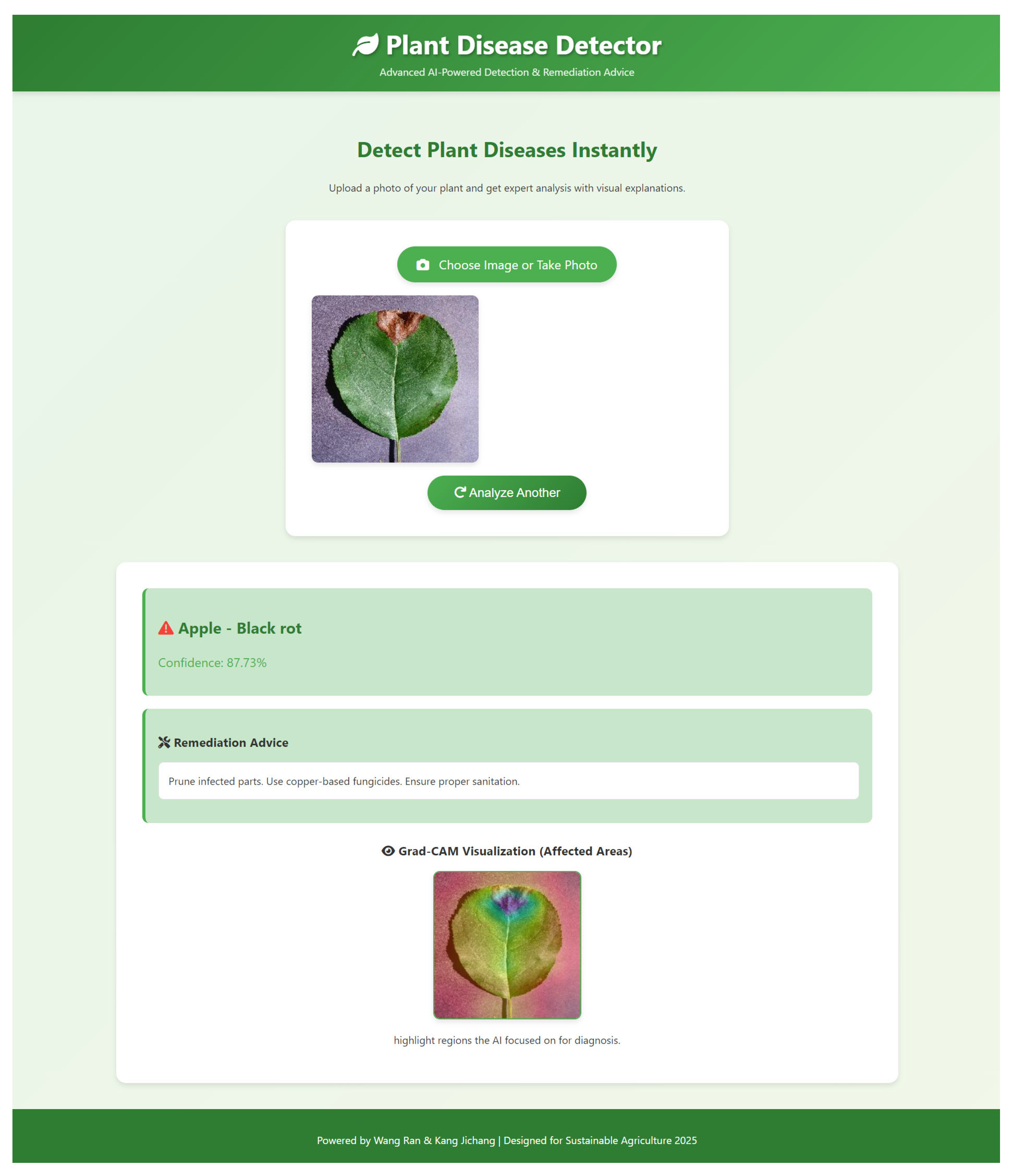 - To enhance practical applicability, we developed an integrated platform combining the SDA-CAH model with an intuitive front-end interface. The system enables real-time image upload, disease diagnosis, Grad-CAM visualization, and remediation guidance, thereby lowering technical barriers and empowering practitioners to leverage AI-driven decision support in precision agriculture.