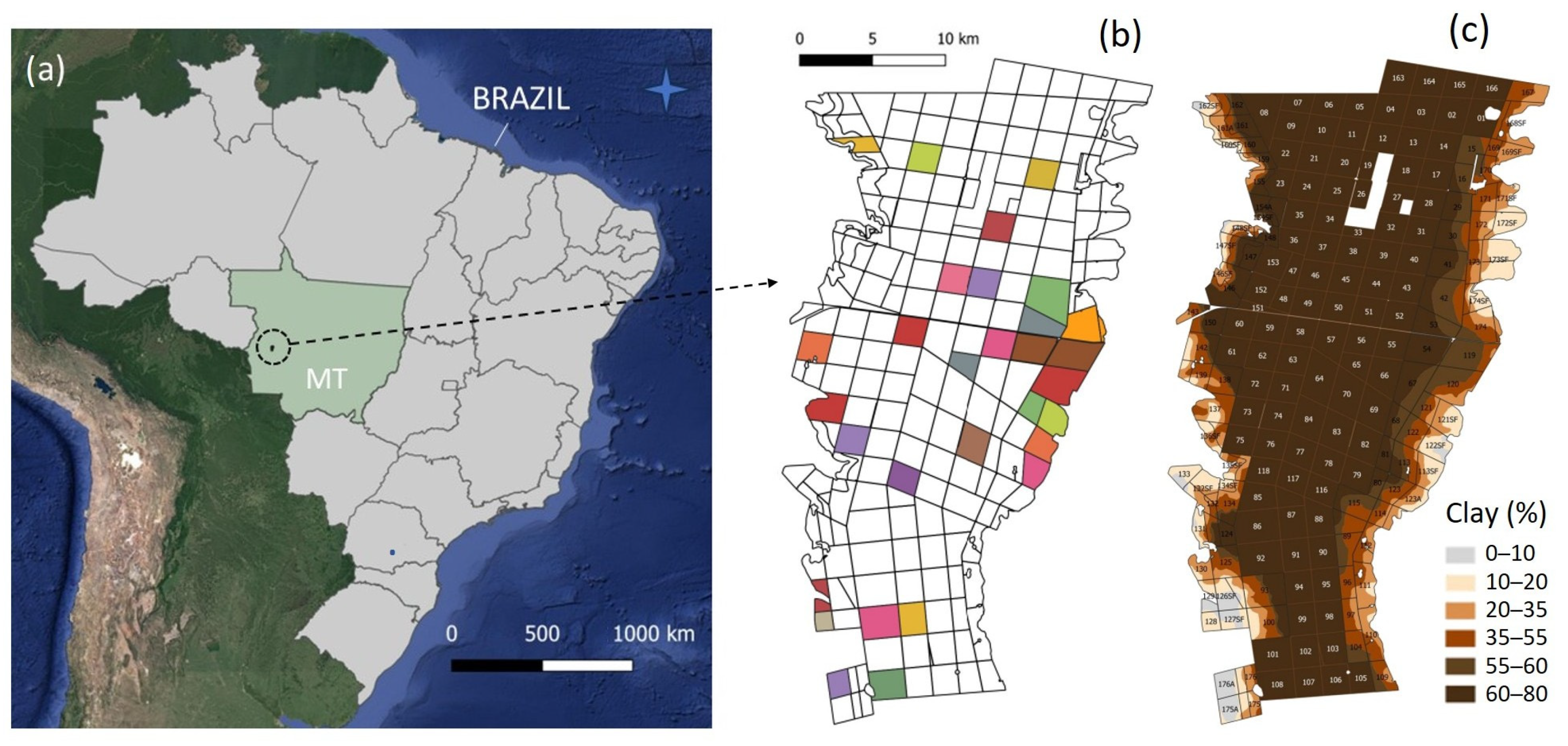 - Speranza, E.A.; Naime, J.M.; Vaz, C.M.P.; dos Santos, J.C.F.; Inamasu, R.Y.; Lopes, I.O.N.; Queirós, L.R.; Rabello, L.M.; Jorge, L.A.C.; Chagas, S.; et al. Delineating management zones with different yield potentials in soybean-corn and soybean-cotton production systems. AgriEngineering 2023, 5, 1481–1497. [Google Scholar] [CrossRef]