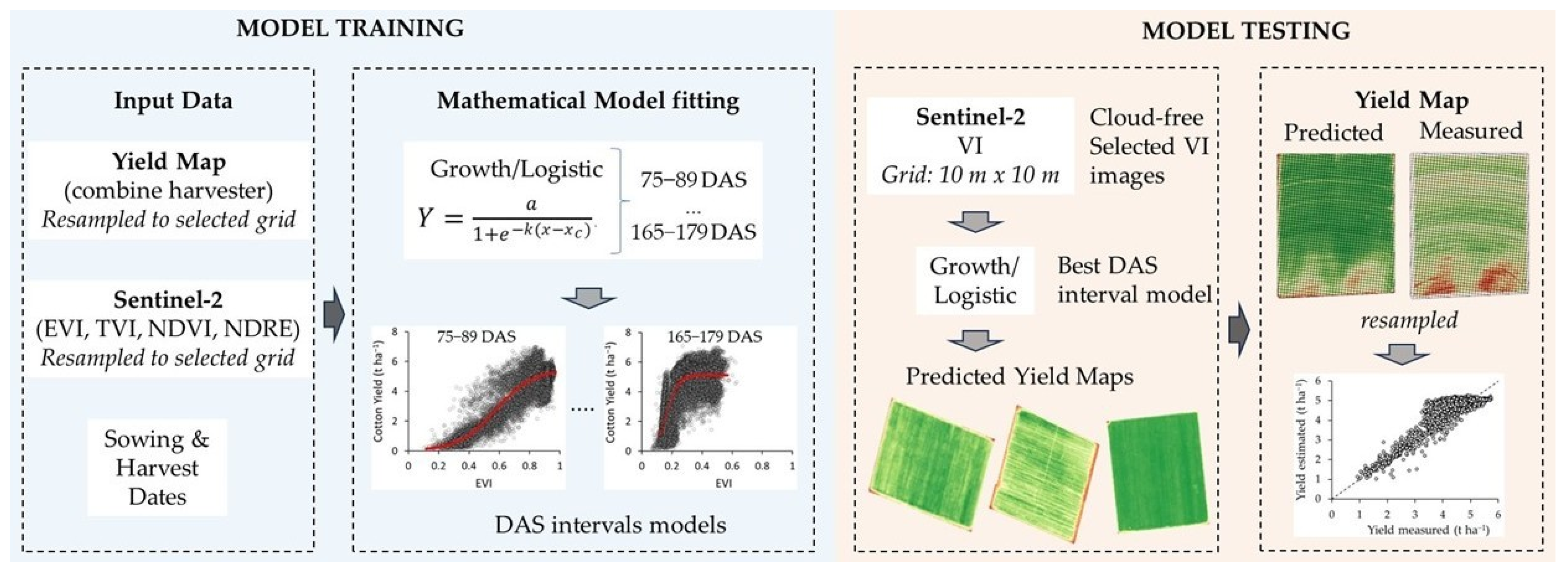 - Ghansah, B.; Landivar Scott, J.L.; Zhao, L.; Starek, M.J.; Foster, J.; Landivar, J.; Bhandari, M. Satellite vs. uncrewed aircraft Systems (UAS): Combining high-resolution SkySat and UAS images for cotton yield estimation. Comput. Electron. Agric. 2025, 234, 110280. [Google Scholar] [CrossRef]