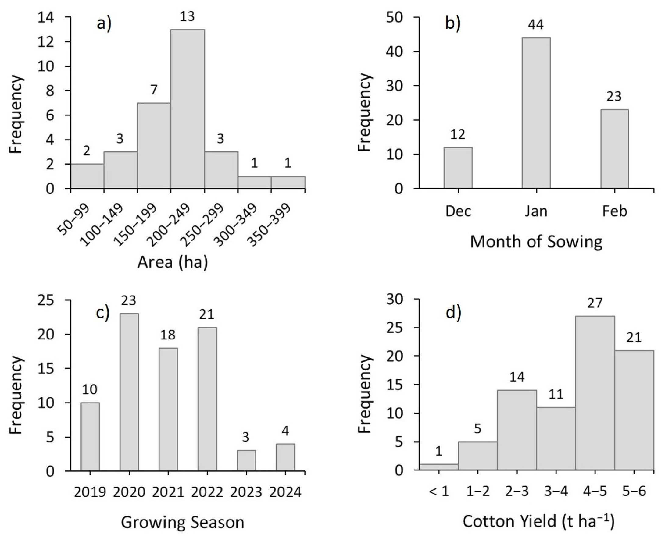 - de Siqueira, D.A.B.; Vaz, C.M.P.; da Silva, F.S.; Ferreira, E.J.; Speranza, E.A.; Franchini, J.C.; Galbieri, R.; Belot, J.L.; de Souza, M.; Perina, F.J.; et al. Estimating cotton yield in the Brazilian Cerrado using linear regression models from MODIS vegetation index time series. AgriEngineering 2024, 6, 947–961. [Google Scholar] [CrossRef]