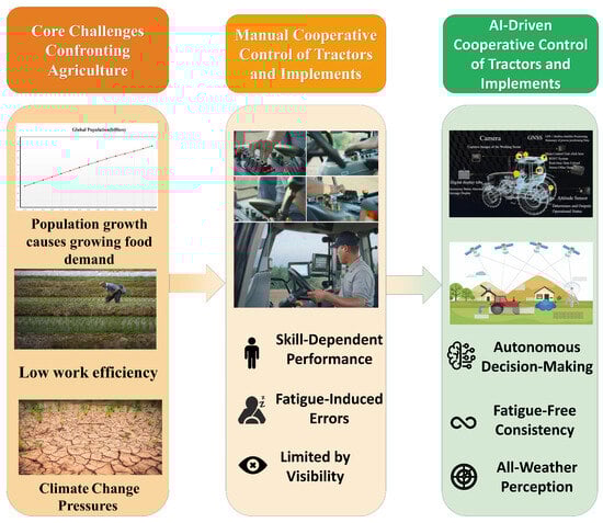 Figure 1 clearly depicts the path of technological evolution: starting from the core challenges facing agriculture, progressing through the inefficient and limited precision of manual collaborative control, and ultimately towards AI-driven autonomous operation of tractors and equipment. This diagram highlights how technology simultaneously addresses the dual challenges of production efficiency and ecological sustainability, presenting a comprehensive overview of the evolution of intelligent agricultural machinery from concept to system.