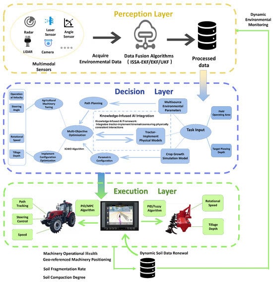 From a system architecture perspective, the effectiveness of knowledge embedding depends not only on the strategy itself but also on its synergistic effect within the overall system. The three-tiered vertical functional framework for intelligent agricultural machinery, shown in Figure 3, embodies this synergistic concept. This framework demonstrates that while the core role of knowledge embedding is concentrated at the decision-making level, its value permeates the entire system: the perception layer improves data quality by embedding sensor physics knowledge; the decision-making layer integrates agronomic and physical constraints for optimization; and the execution layer incorporates an understanding of organizational dynamics to achieve precise control.