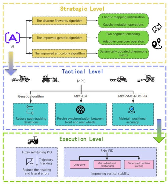 Dynamic modeling provides a theoretical basis for tractor control. However, the agricultural environment is highly variable, which poses a challenge to the reliability of precise models. Fixed control parameters cannot adapt to all working conditions, which is precisely a manifestation of the lack of system robustness. Therefore, modern intelligent agricultural systems adopt adaptive control strategies to enhance accuracy and robustness under complex conditions. As shown in Figure 4, we advance physically aware control strategies that dynamically adapt to field heterogeneity. By optimizing task allocation and path optimization through intelligent algorithms at the strategic level, achieving precise trajectory planning and real-time adjustment through model predictive control (MPC) at the tactical level, and ensuring real-time regulation through adaptive PID and neural network control at the execution level, we can achieve centimeter-level positioning accuracy in complex farmland environments and significantly enhance operational efficiency and system reliability. The feasibility of this adaptive strategy has been widely supported. Bhat and Wang point out that AI and adaptive control are the key trends to deal with the uncertainty of the agricultural environment [26], while Che et al.’s field experiments confirm that such strategies can achieve centimeter-level path tracking accuracy [61].