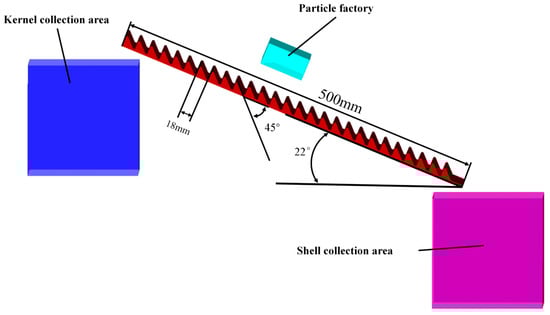 To achieve the separation of 1/2 shell and 1/8 kernel, the tooth slots of the toothed vibrating screen are designed with reference to the dimensions of 1/8 kernel and 1/2 shell. This design allows the kernel to more easily fall into the tooth slots, while the shell is blocked outside the slots. At the same time, it ensures that the 1/8 kernel moves upward step by step with the vibration on the toothed vibrating screen surface with a certain inclination angle. Due to the significant size difference and smooth surface, the 1/2 shell tends to move downward during vibration, thereby achieving the separation of the 1/2 shell and the 1/8 kernel. Regarding the parameters of the sawtooth screen, the size of the screen surface is set according to the actual effective working area. The specific dimensions and simple model are shown in Figure 2. The parameter characteristics and other contact coefficients of the geometric model in the simulation are shown in Table 2 and Table 3, respectively. These parameters are also obtained based on previous literature and experiments [18,23,26,27,28].