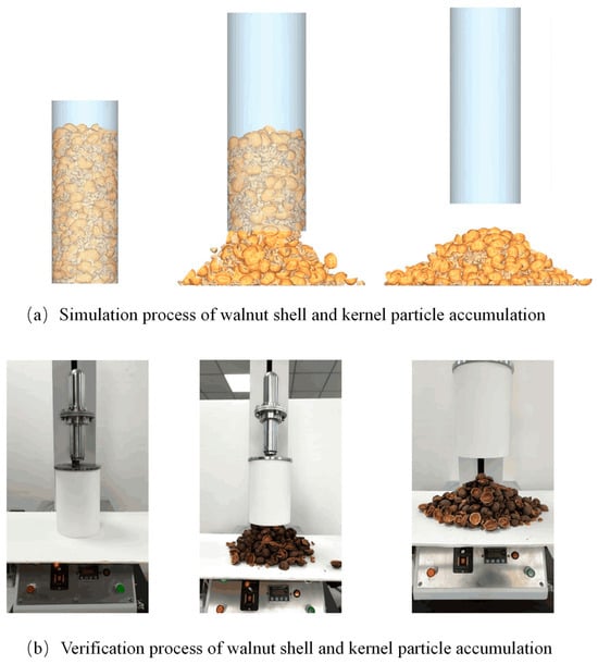 To verify the accuracy of the numerical model and with reference to previous studies, this paper uses a piling angle test to validate the physical property parameters and contact coefficients between materials in the simulation [34,35,36]. The piling test in a cylindrical container is typically set according to the maximum particle size of the material, requiring the cylinder diameter to be 4–5 times the maximum particle diameter and the cylinder height to be 3 times the cylinder diameter [37]. In the simulation, there are only two types of materials: 1/2 shell and 1/8 kernel. Therefore, based on the long axis of the walnut shell (with a maximum size of 38.3 mm), the cylinder diameter is set to 160 mm and the height to 480 mm. In the particle factory, a mixture of walnut shells and kernels is generated at a mass ratio of 1:1, filling 80% of the cylinder volume. After the generation of 1/2 shell and 1/8 kernel particles, the system is left to rest for 2 s to reach a stable state before the cylinder is lifted vertically. Studies have shown that the lifting speed of the cylinder affects the formation of the particle pile [38]. Therefore, in this paper, the cylinder is lifted at a speed of 0.05 m/s until all material has been released from the cylinder and the particle pile is in a static state. Figure 4 shows the simulation test process and the verification test equipment and process.