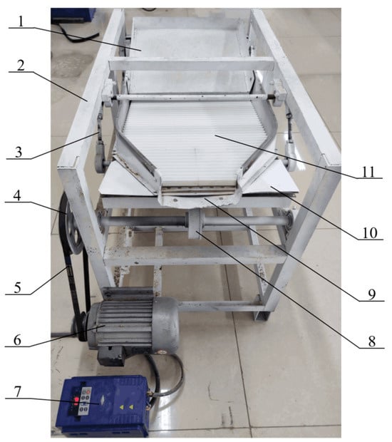 Toothed vibrating screen walnut kernel separation test bench. 1. Feed plate; 2. Frame; 3. Oscillating arm; 4. Pulley;5. Belt 6. Motor; 7. Variable frequency drive; 8. Eccentric wheel; 9. Walnut kernel outlet; 10. Vibrating screen frame; 11. Toothed vibrating screen.